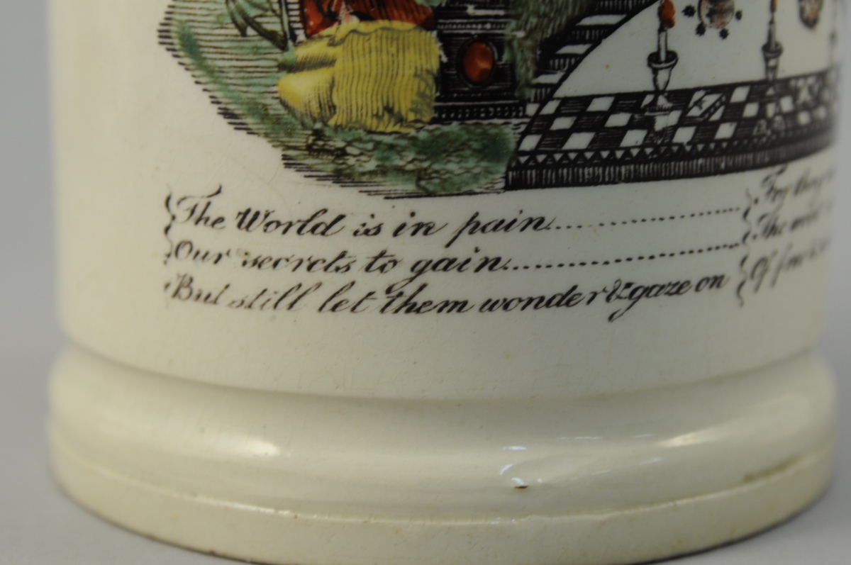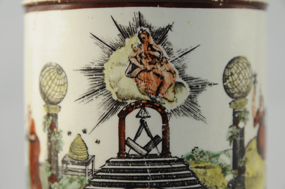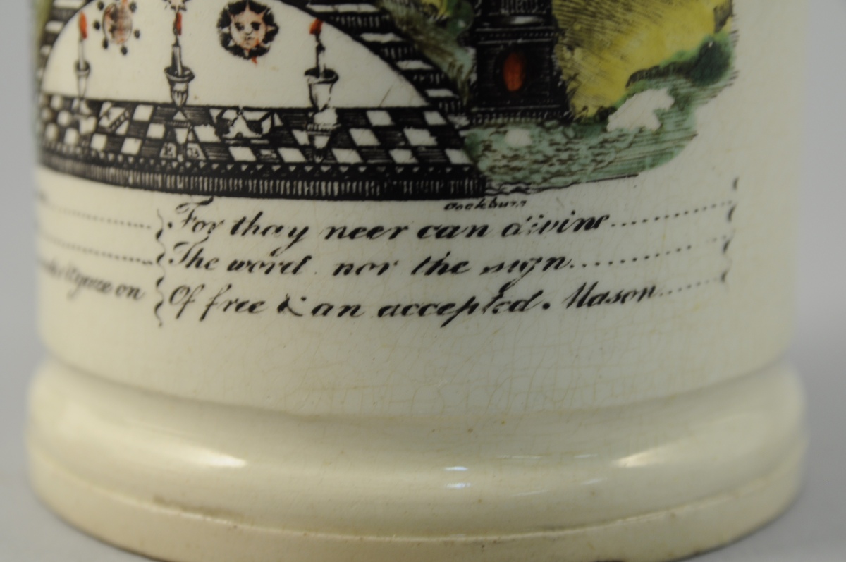 - Chope en faïence fine à fond crème. Décor polychrome imprimé maçonnique, filet marron sur le bord et petit poème en anglais. XXème. Haut. 11,8, Diam. 8,7 cm.