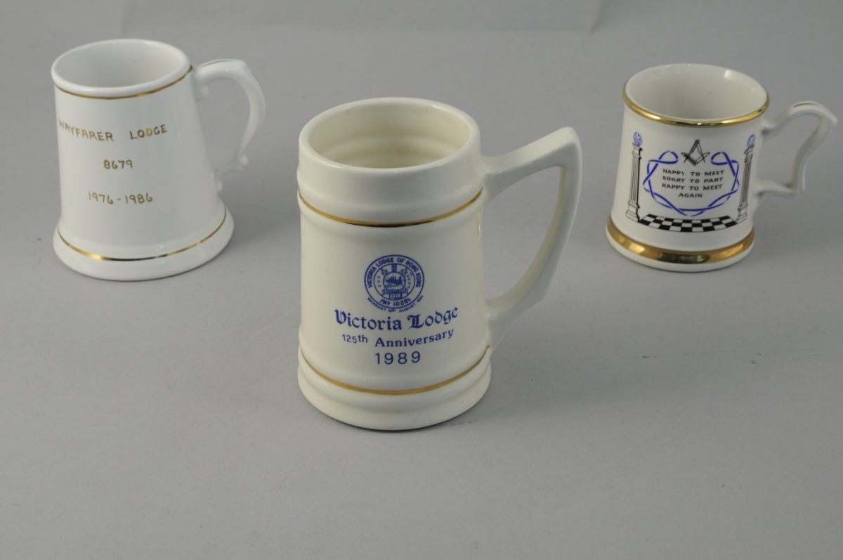 - Chope commémorative en faïence fine à fond crème. Emblème de la Loge Victoria de Hong Kong. Décor de filets or. Marquée "125th Anniversary / 1989". XXème. Haut. 14,6, Diam. 8,7 cm.