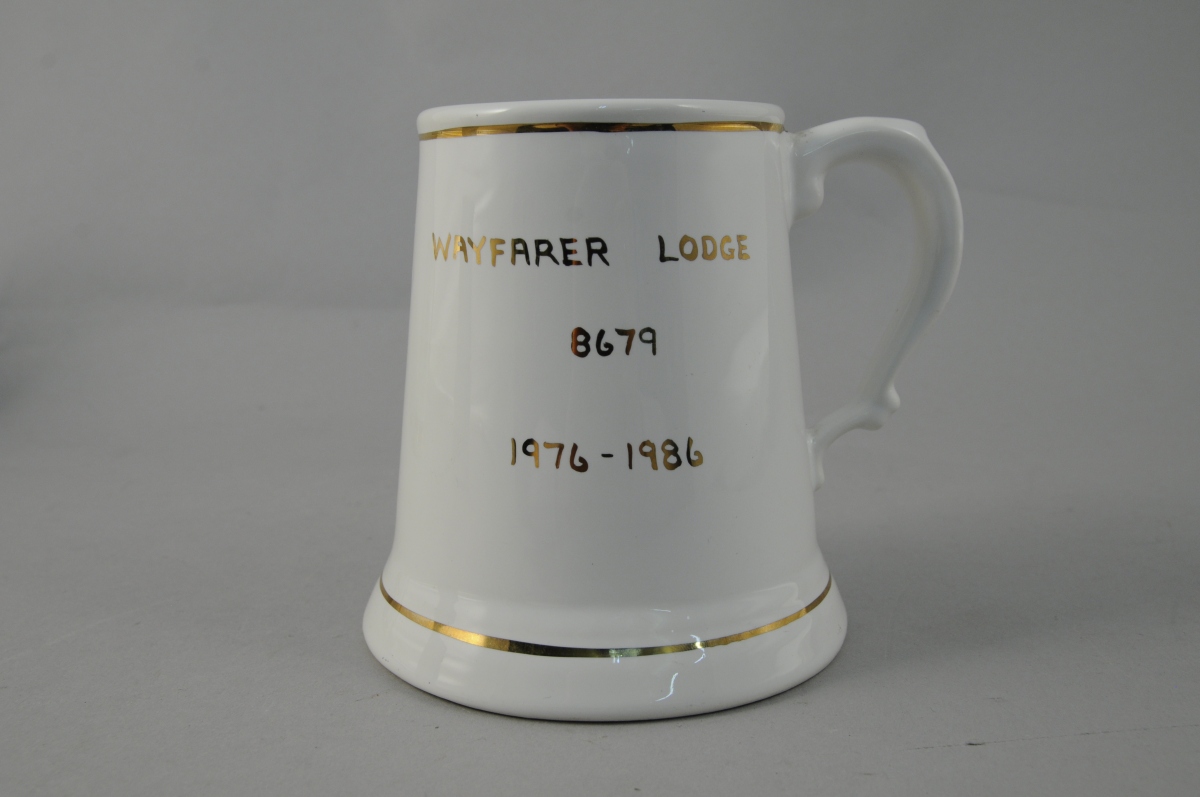- Chope en faïence fine à fond crème. Décor maçonnique en noir et bleu avec équerre, compas, colonnes et globes. Filets or. Au centre du décor, l'inscription "Happy to meet / Sorry to part / Happy to meet again". Marquée à l'or "Loge Old English Night ", datée de 1964 et ayant appartenu à "Albert Edward". Haut. 10, Diam. 8,7 cm.