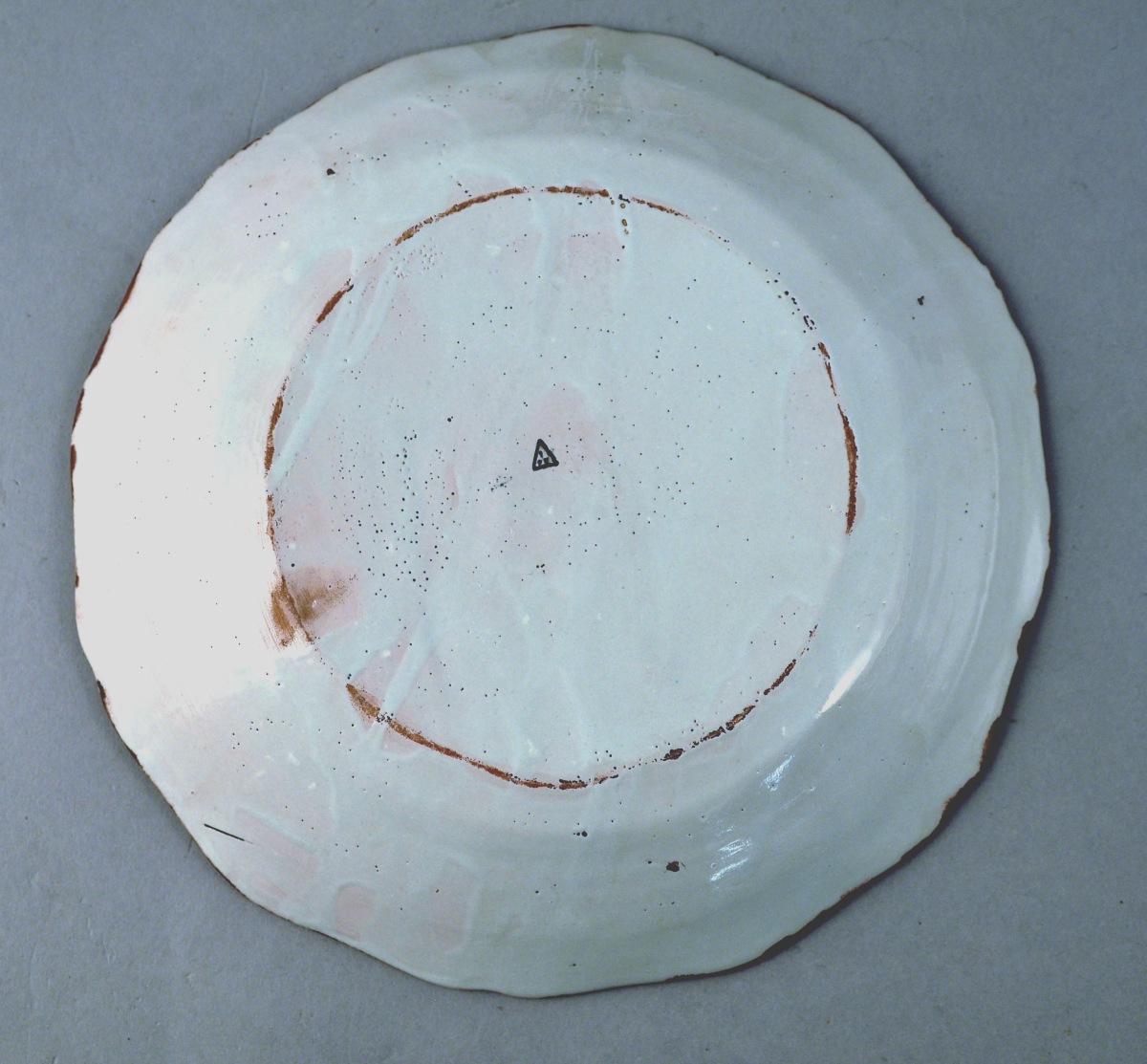 CENTRE de la France. ASSIETTE en faïence à bord contourné. Décor polychrome d'une couronne de laurier et de feuilles de chêne centrée d'une étoile centrée d'un "G" et sommée d'une pyramide. Oeil, trophés d'attributs maçonniques et feuillages sur l'aile. XIXème. Diam. 23,3 cm. (légères usures à l'émail)