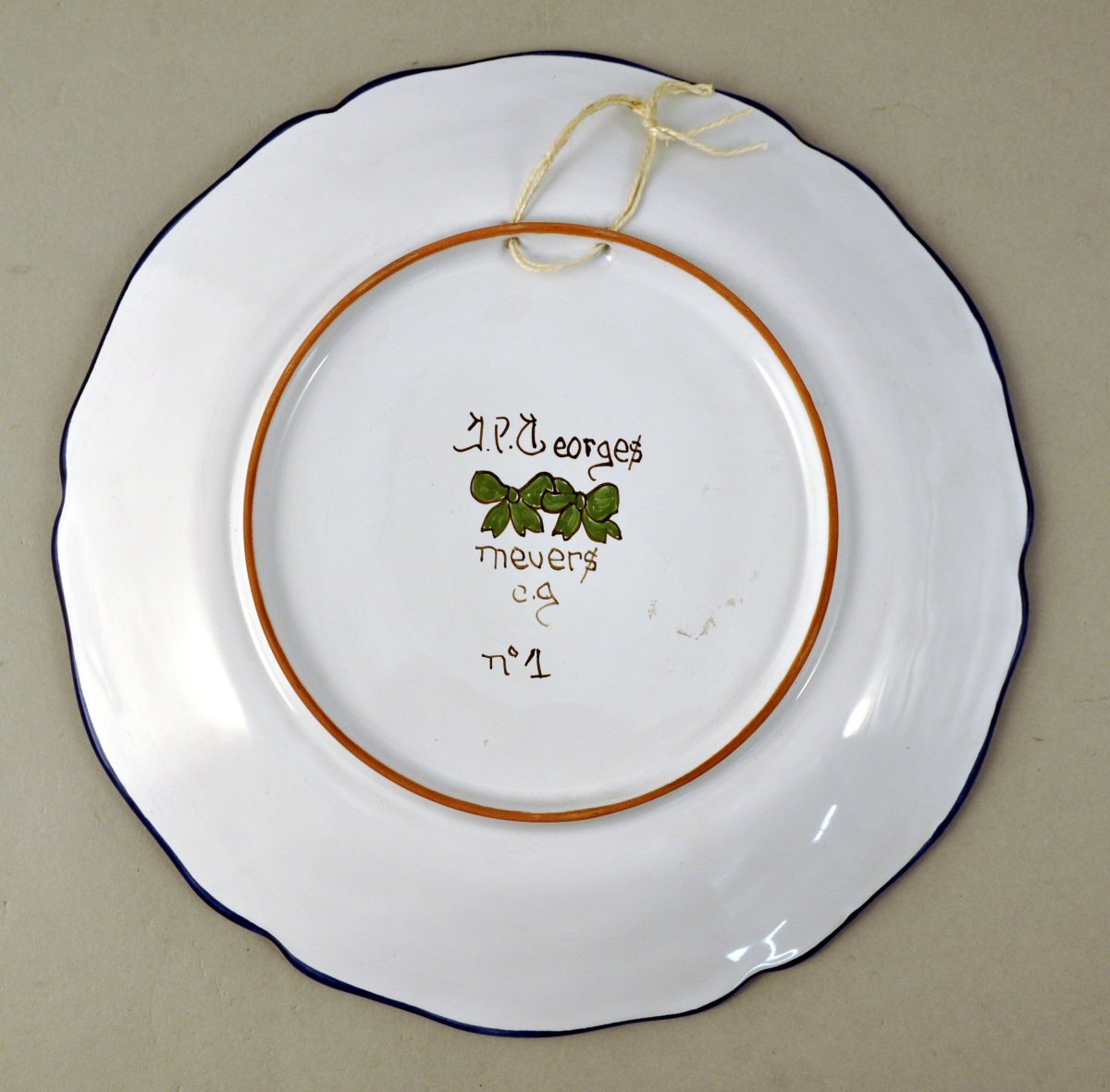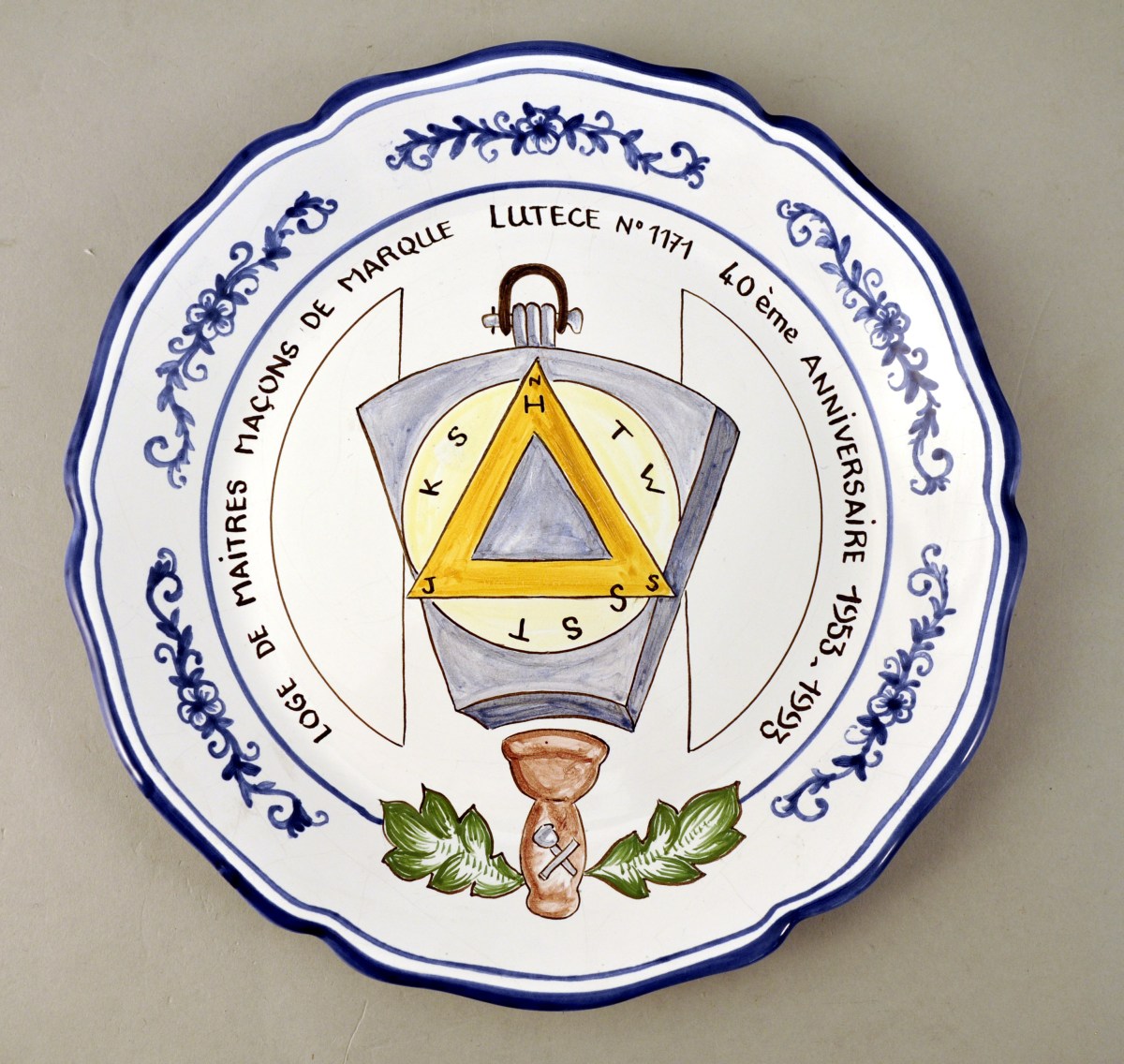 NEVERS. ASSIETTE commémorative en faïence à bord contourné. Décor polychrome d'attributs maçonniques sur le bassin. Inscription "Loge des maître maçons de marque / Lutèce n°1171 / 40ème anniversaire / 1953-1993". Rinceaux et filets bleus sur l'aile. Marquée au revers "J.P Georges / Nevers / C.9 / N°1". XXème. Diam. 25,2 cm.