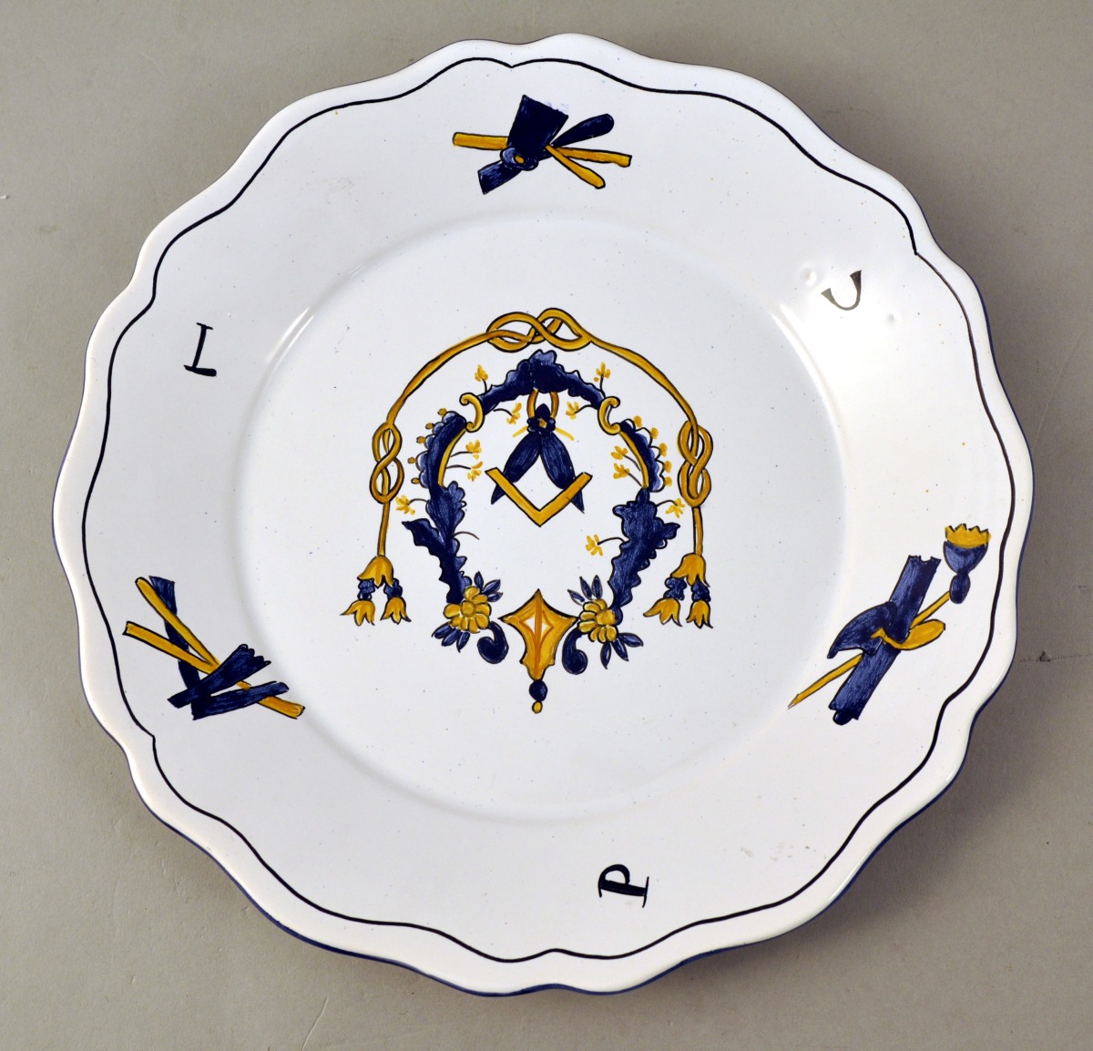 ASSIETTE en faïence à bord contourné. Décor bleu et ocre du compas et de l'équerre entourés de rinceaux fleuris et d'une corde nouée sur le bassin. Trophées maçonniques et letres "L / U / P" sur l'aile. Filet noir sur le bord. Marquée "Poterie des Salines / St Trojan / F. main / C.C ". XXème. Diam. 25,5 cm.