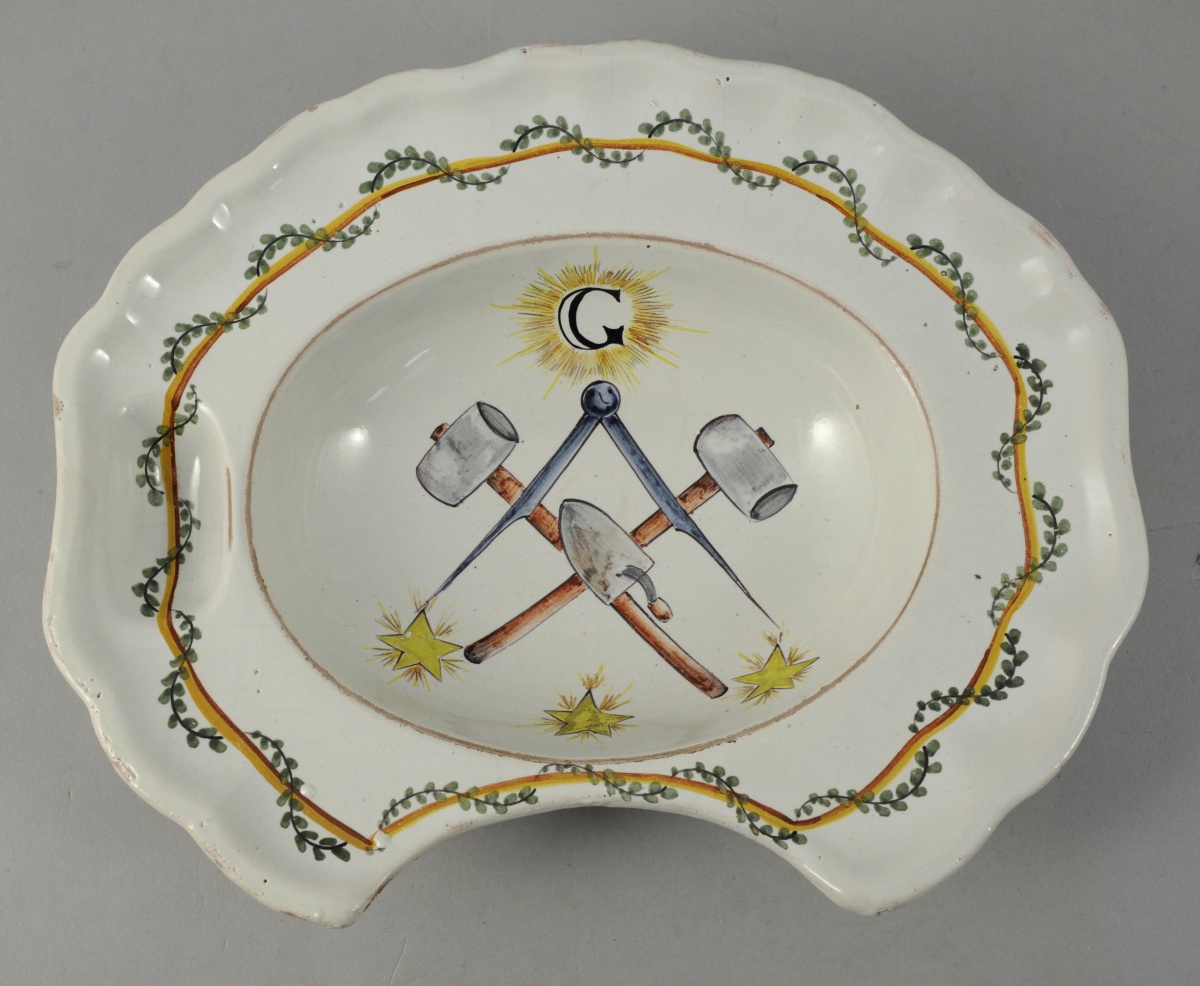 SUD de la FRANCE. PLAT à BARBE en faïence à bord contourné. Décor polychrome de deux maillets, du compas, de la truelle, de trois étoiles et d'une étoile centrée d'un "G". Guirlande de feuillages et filets ocre et marron sur l'aile. Fin XIXème. Long. 28,5 cm.