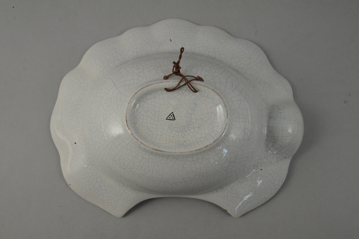 CENTRE de la FRANCE. PLAT à BARBE en faïence craquelée à bord contourné. Décor polychrome d'une pyramide, d'un soleil, du livre des Statuts Généraux, de feuillages et des mots "FORCE / SAGESSE / LIBERTÉ" sur le bassin. Oeil, trophées maçonniques et feuillages sur l'aile. Fin XIXème. Long. 26,8 cm.