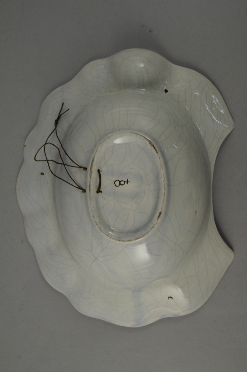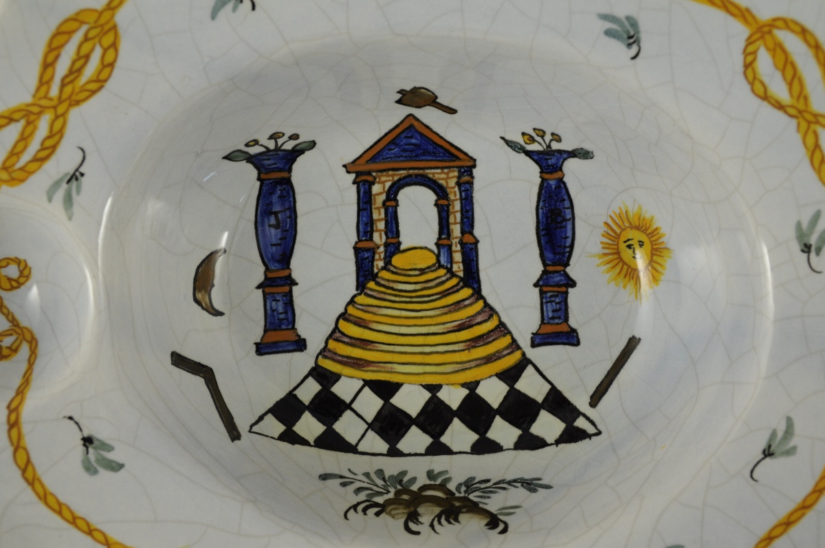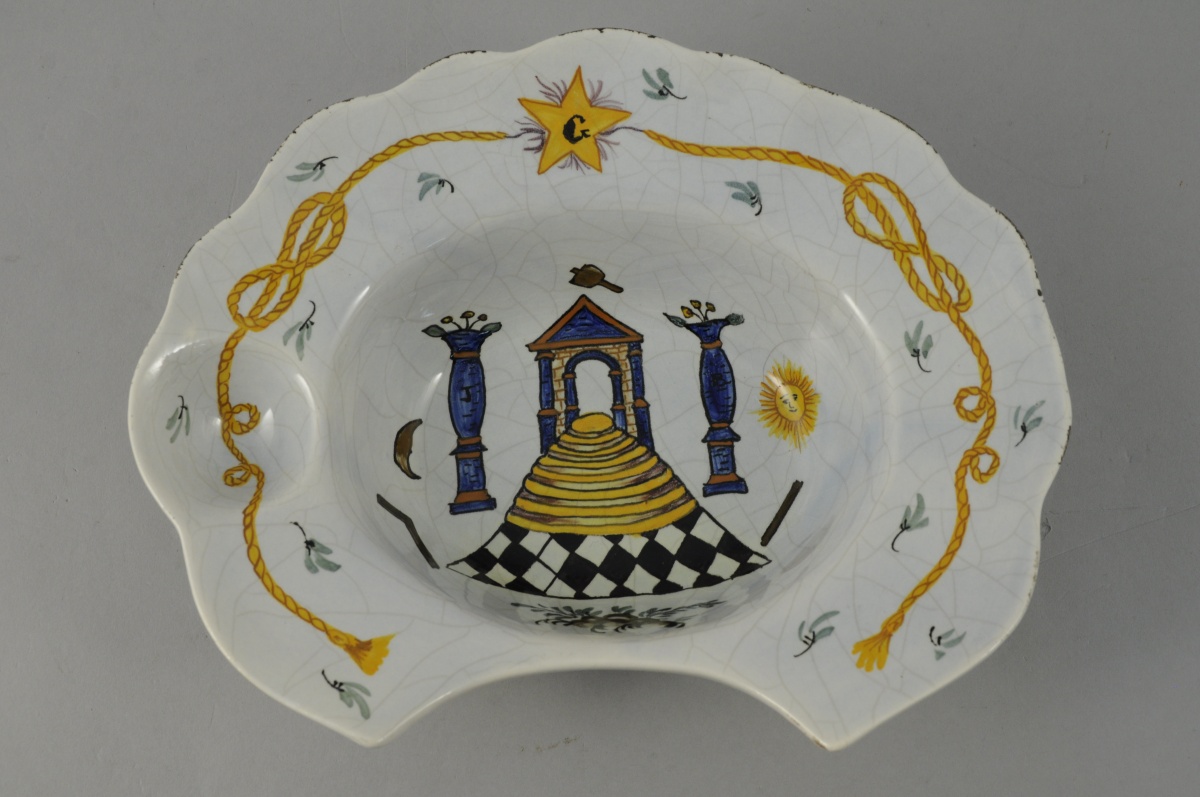 CENTRE de la FRANCE. PLAT à BARBE en faïence craquelée à bord contourné. Décor polychrome d'un temple, du pavé mosaïque, de deux colonnes portant les lettres "J" et "B", d'attributs maçonniques et d'un rocher feuillagé sur le bassin. Étoile centrée d'un "G", corde nouée et feuillages sur l'aile. Fin XIXème. Long. 26,7 cm.