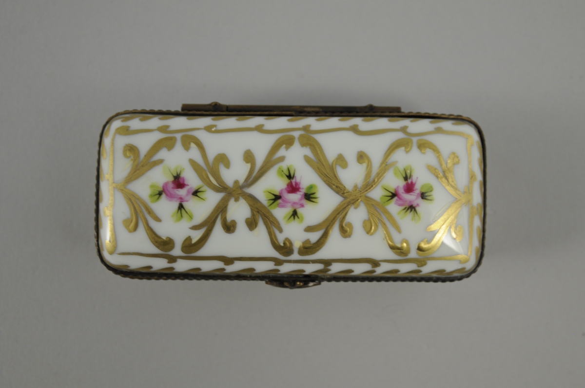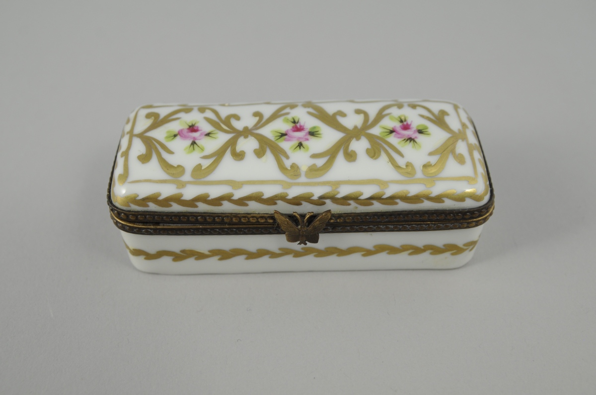 LIMOGES. PETITE BOITE rectangulaire en porcelaine. Décor polychrome et or de fleurs et feuillages en rappel à l'intérieur. XXème. Haut. 2,6, Larg. 8,5, Prof. 3,5 cm.