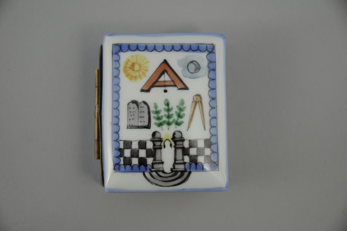 LIMOGES. PETITE BOITE rectangulaire en porcelaine. Décor polychrome d'attributs maçonniques. Filet bleu sur le bord. A l'intérieur, une étoile et une branche feuillagée. XXème. Haut. 2,2, Larg. 5,8, Prof. 4,7 cm.