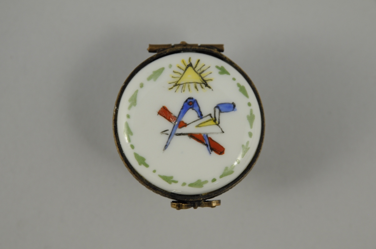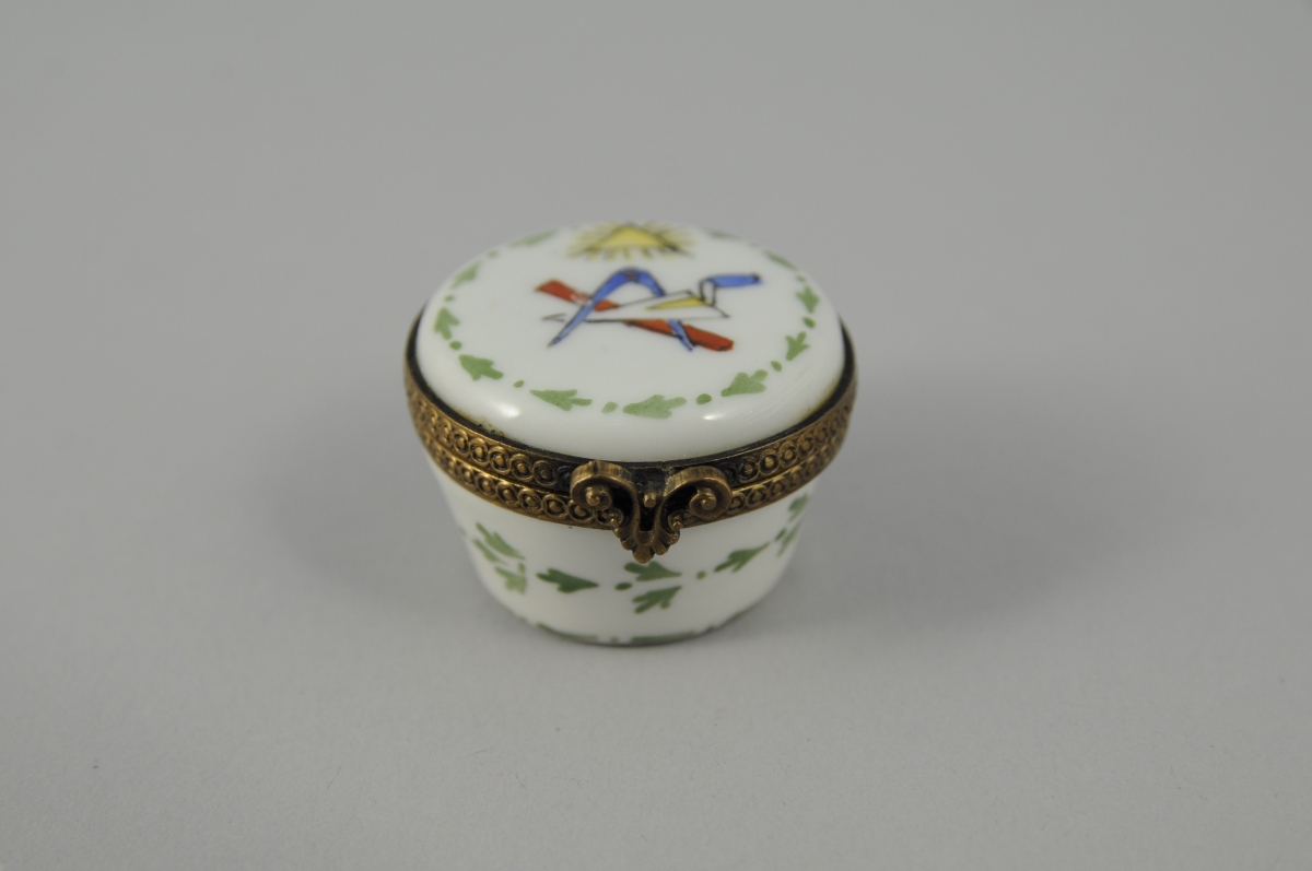 PETITE BOITE circulaire en porcelaine. Décor polychrome d'attributs maçonniques. Rinceaux verts sur les bords et en rappel à l'intérieur. Marque de Sèvres (?) au revers. XXème. Diam. 3,4 cm.