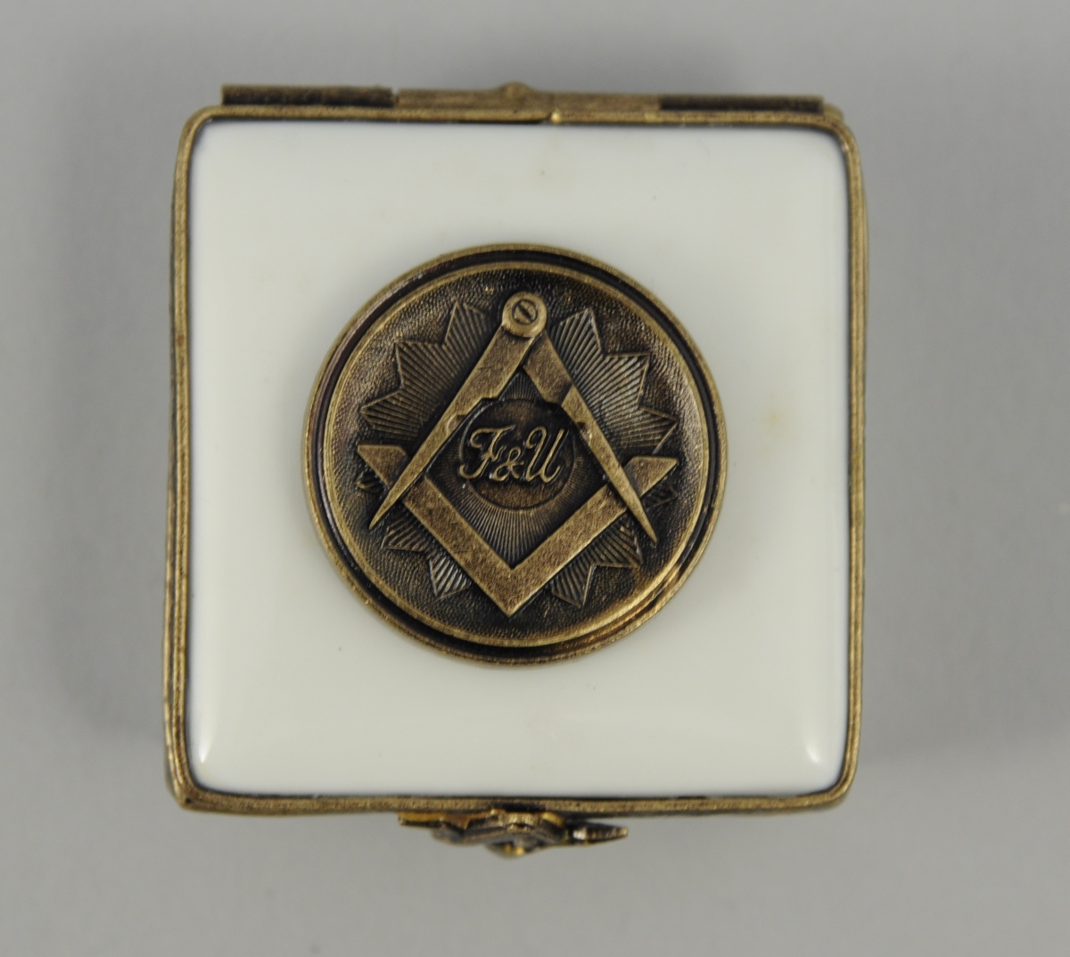 LIMOGES. PETITE BOITE carrée en porcelaine. Médaillon en bronze orné du compas, de l'équerre et de l'inscription "F&U" sur le couvercle. A l'intérieur, une branche feuillagée. Marquée "LIMOGES FRANCE" au revers. XXème. Larg. 3,7 cm.