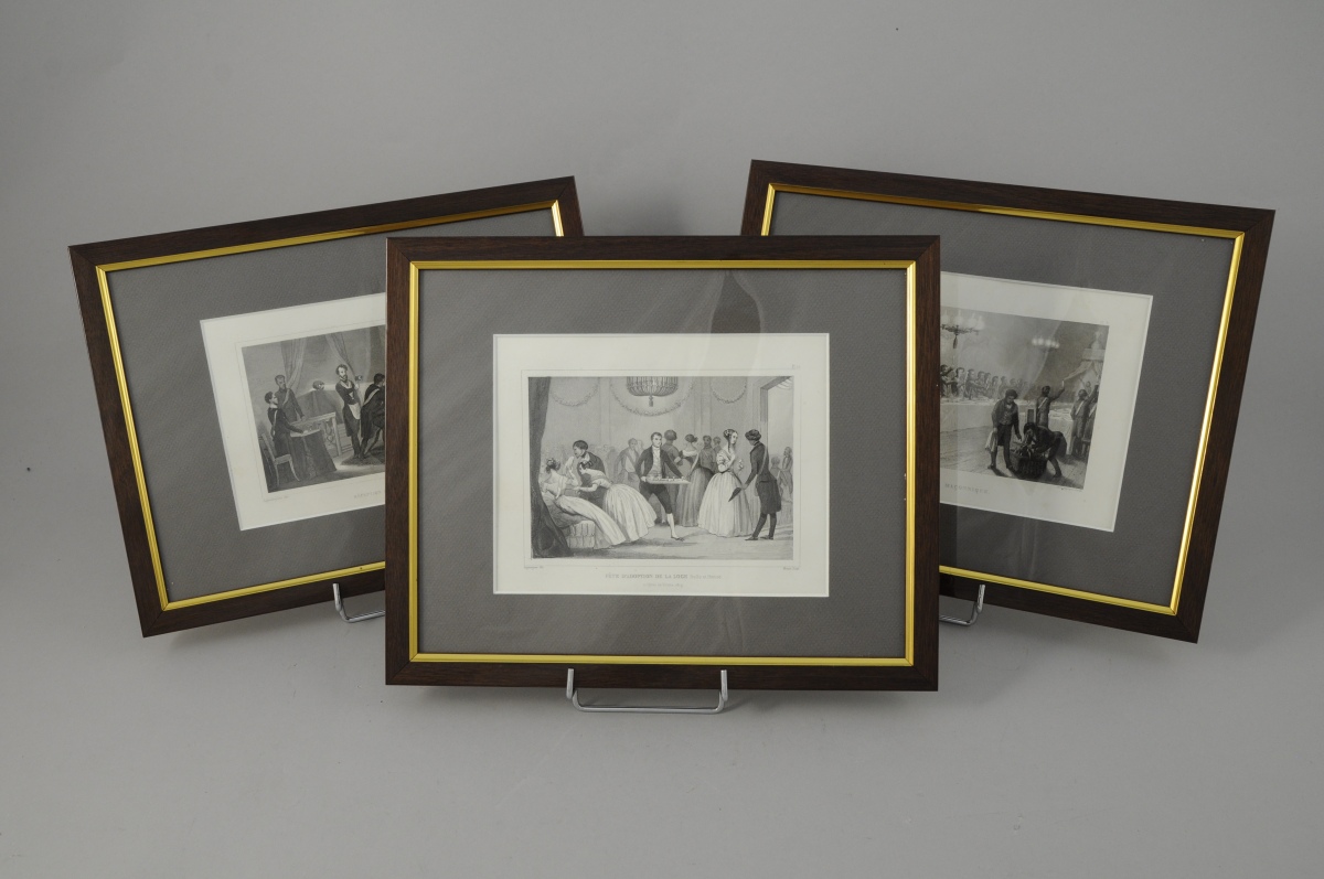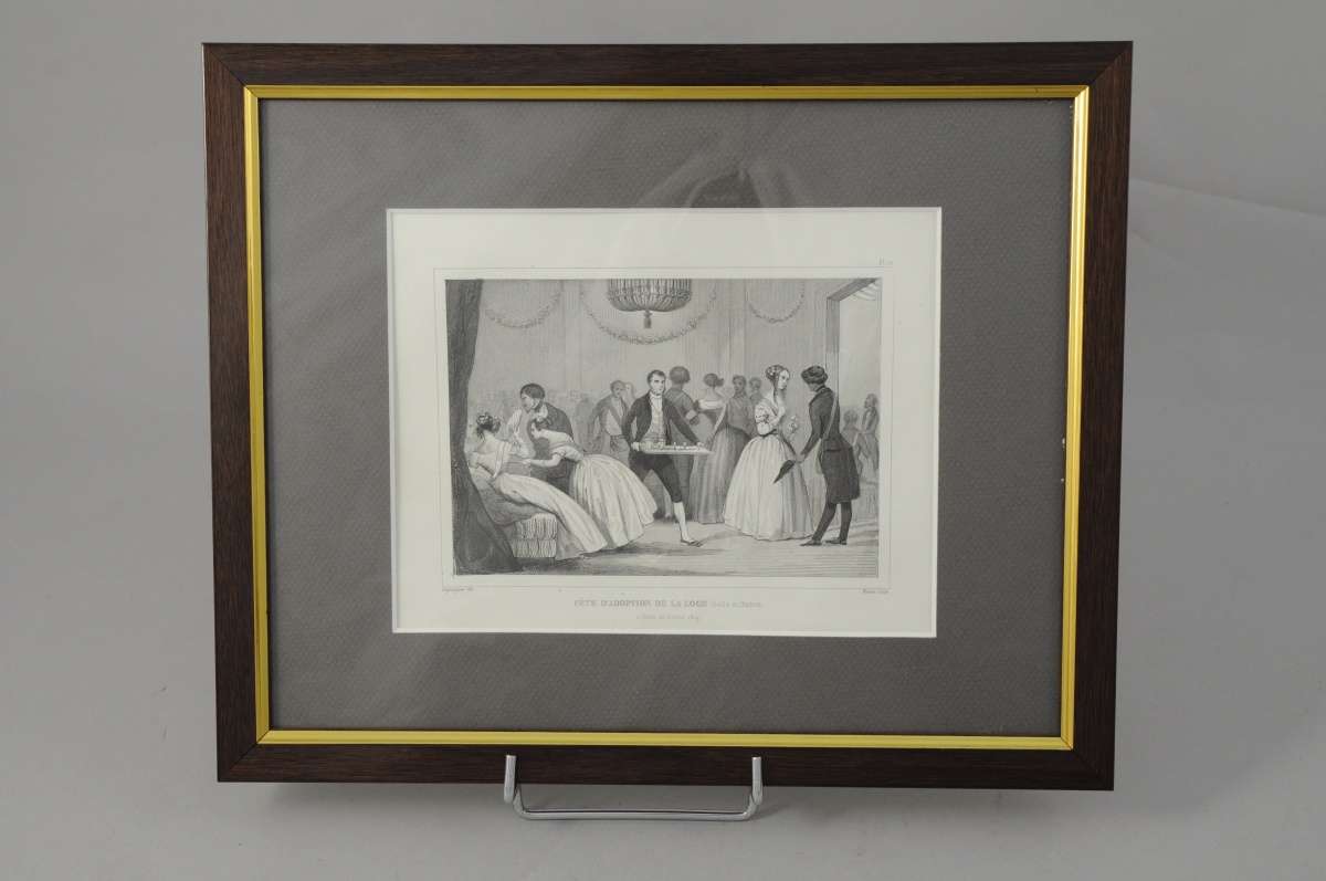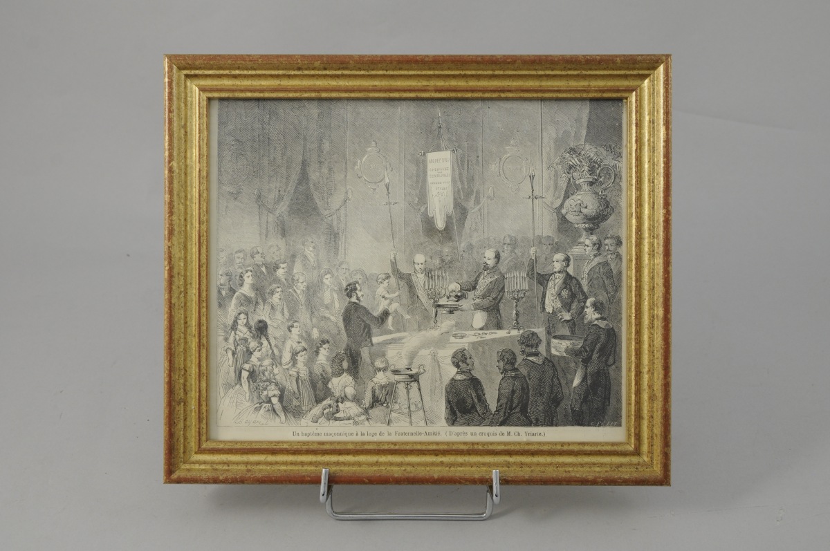 Joint: une illustration de presse encadrée signée BAYARD et C. PETIT et légendée "Un baptême maçonnique à la loge de la Fraternelle-Amitié. (d'après un croquis de M. Ch. Yriarie)". 17,7 x 22,1 cm.
