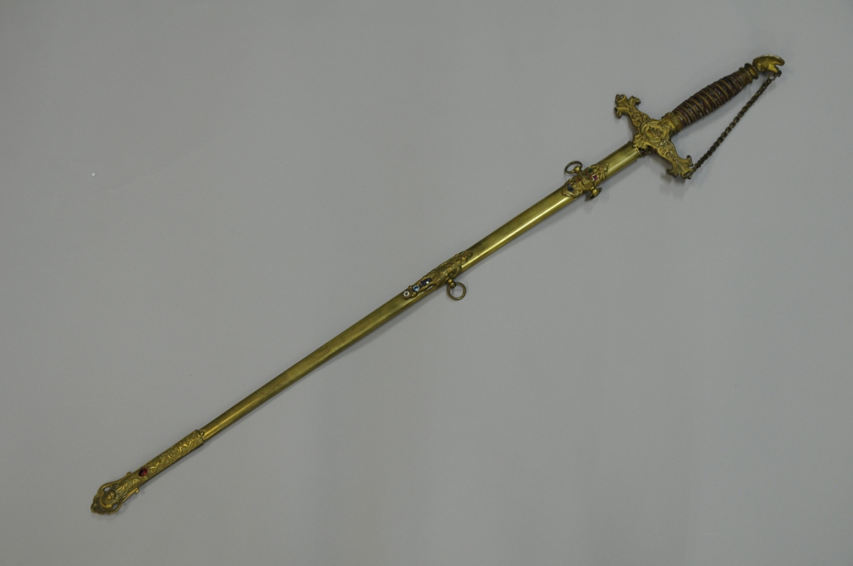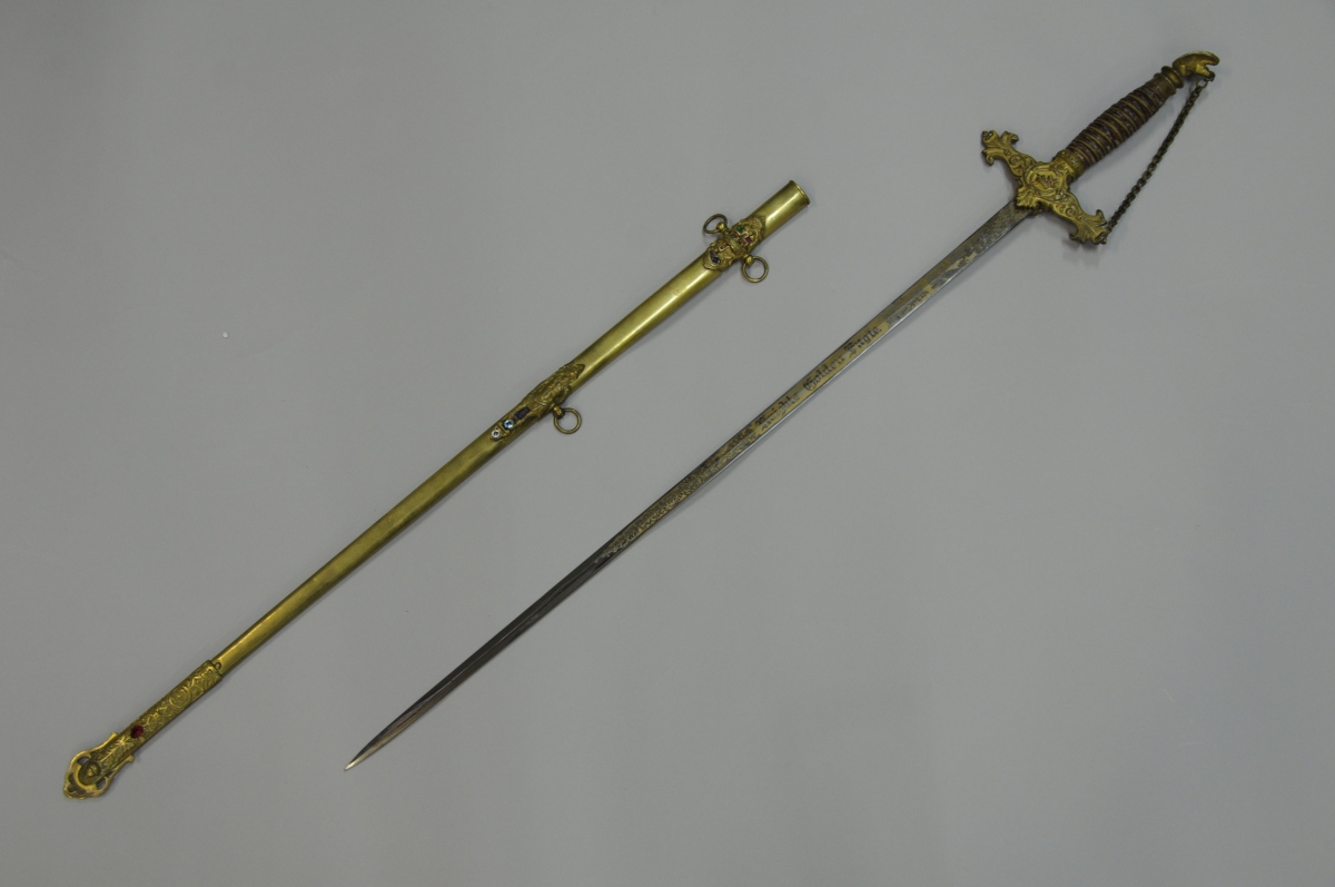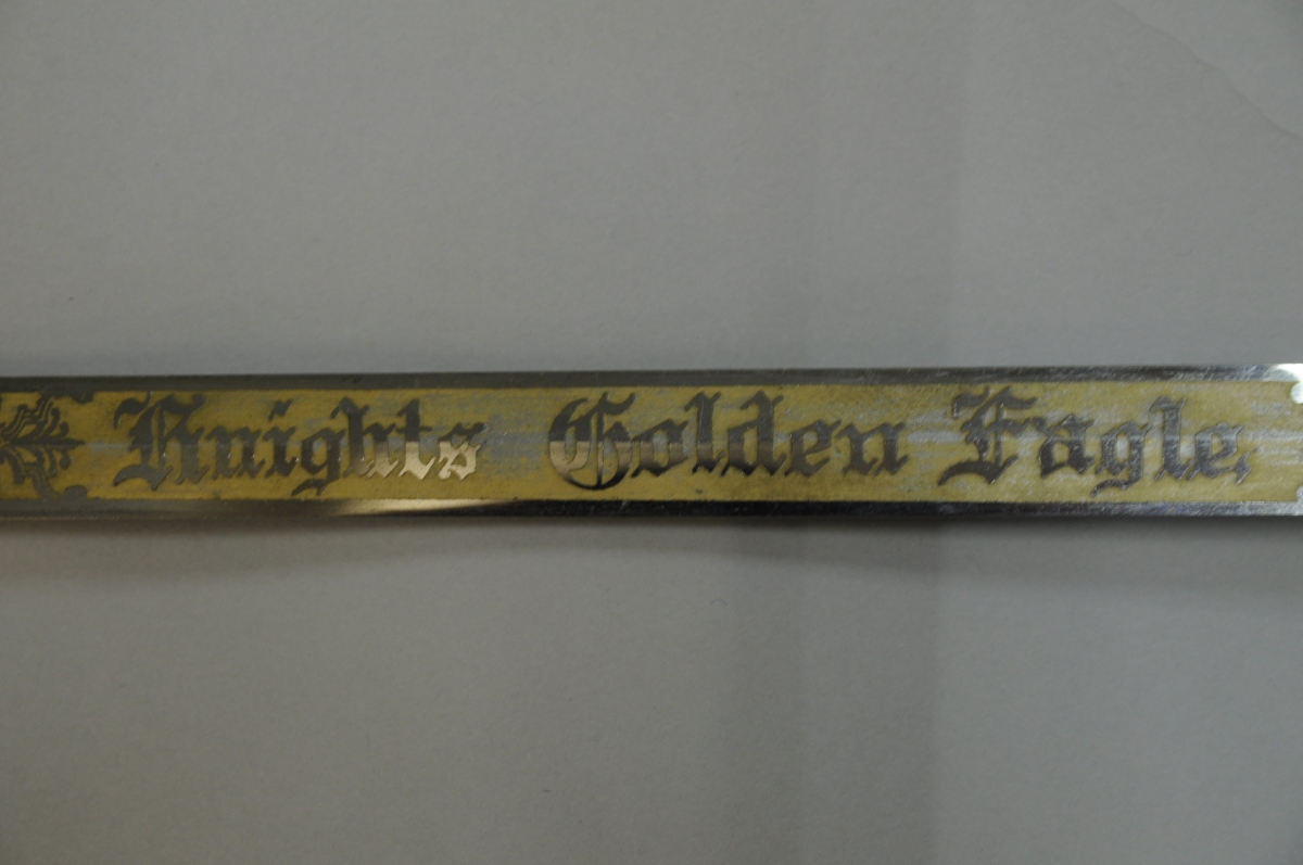 ÉPÉE de CHEVALIER. Poignée en cuir et garde cruxiforme à chainette à deux quillons en bronze ciselé orné de rinceaux et fleurons et surmontée d'un aigle en ronde-bosse. Noeud de corps à décor d'une croix et d'une couronne dans un cartouche et des lettres "K.G.E" dans un écu surmonté d'un aigle. Lame droite à arête centrale gravée d'un philactère portant l'inscription "HORSTMANN / BROS & co / PHIL PA", d'un chevalier couronné par un ange, d'un chevalier à l'étendard, de l'inscription "KNIGHTS GOLDEN EAGLE" et "HERRY IF SNOOK", d'un écu marqué "K.G.E / F.H.L" et de rinceaux. Fourreau en laiton et bronze ciselé à trois anneaux d'attache. Décor d'une crois et d'une couronne, d'un chevalier, de rinceaux et de pierres de couleurs. XXème. Long. de la lame: 68 cm.