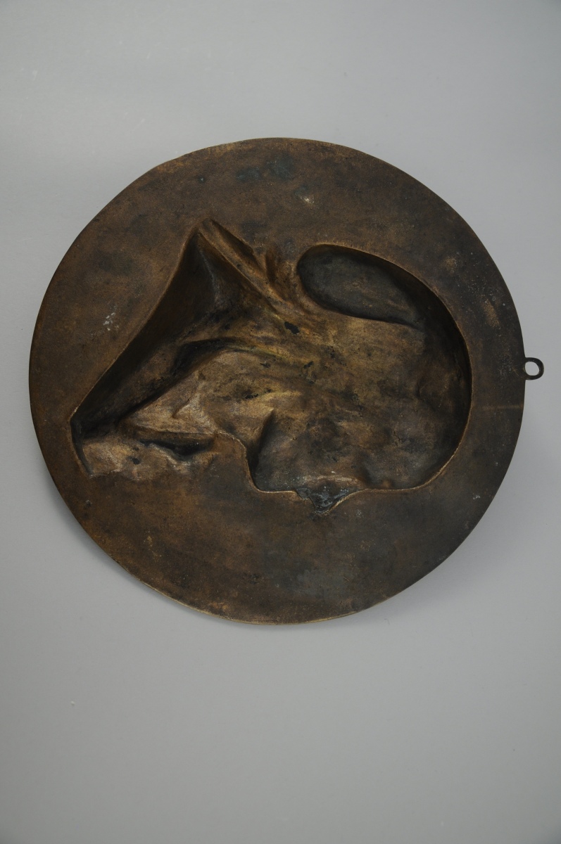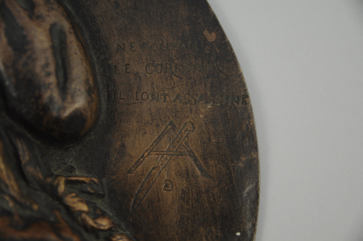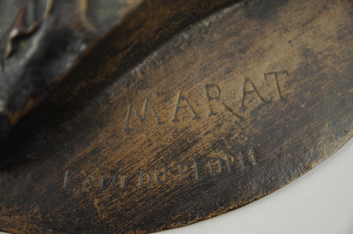 MÉDAILLON en bronze à patine brune représentant un portrait de MARAT au bonnet phrygien. Porte l'inscription gravée "MARAT / L'AMI DU PEUPLE" et "NE POUVANT LE CORROMPRE, ILS L'ONT ASSASSINÉ" ainsi qu'un couteau traversant un perpendiculaire. Daté "1868", signature illisible. Diam. 22,6 cm.