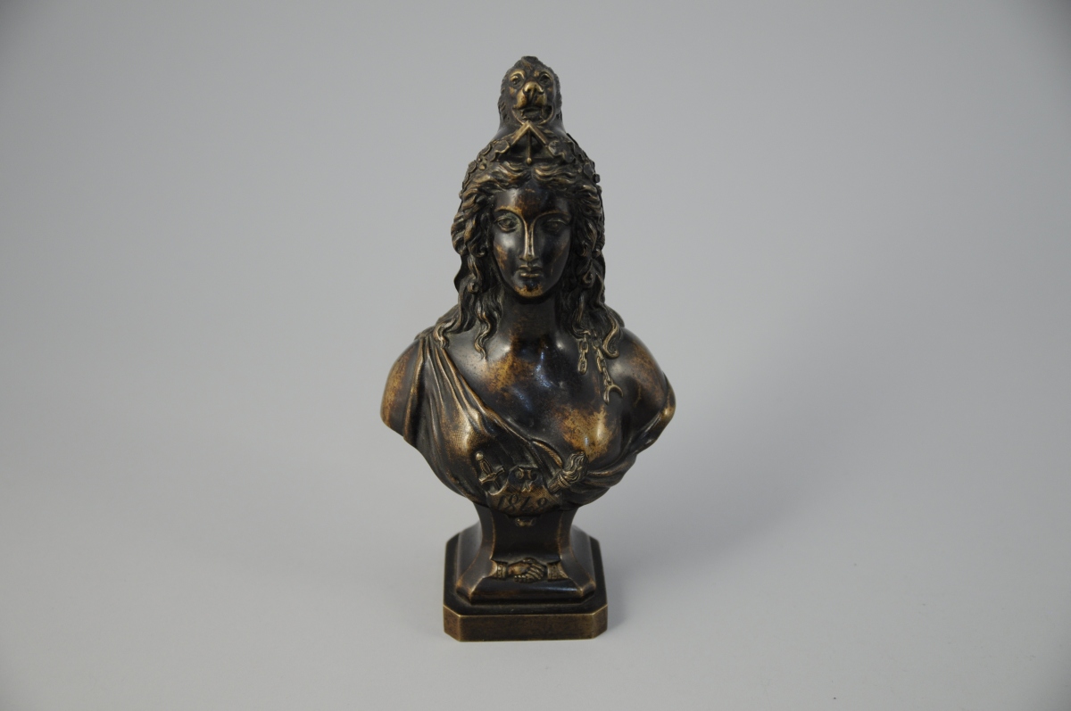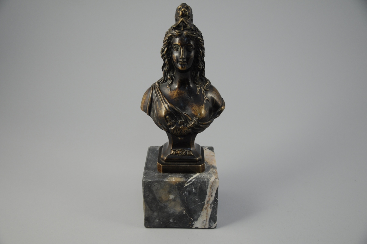 MARIANNE en bronze à patine brune. Elle est coiffée d'un casque à cimier en forme de lion, d'un perpendiculaire et d'une couronne en feuilles de chêne. Sur sa poitrine, un flambeau, une épée et un cartouche portant la date "1848". Poignée de main sur la base. Socle cubique en marbre gris et rose. Haut. 20,3 cm (sans socle), Haut. 28,2 cm (avec socle).