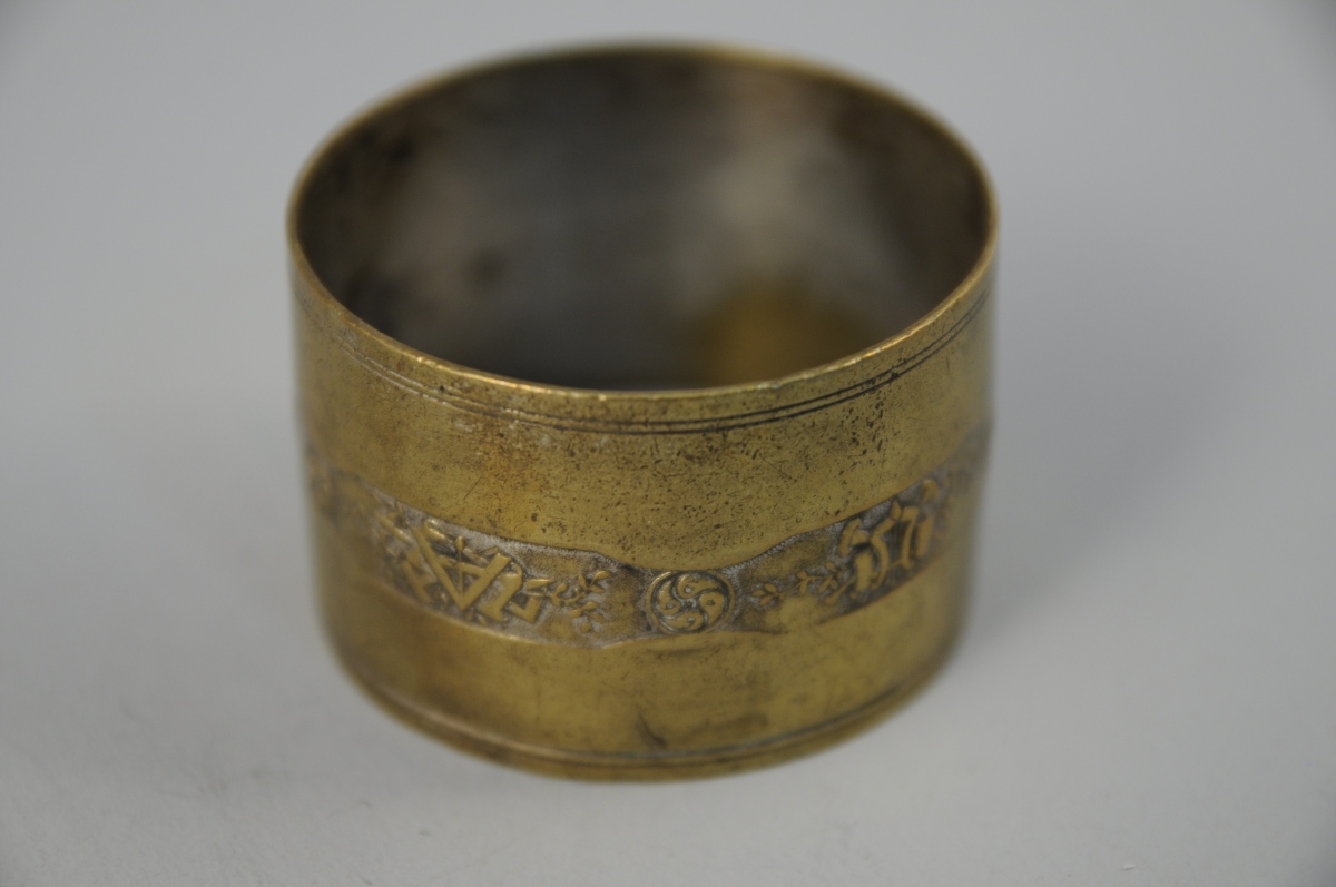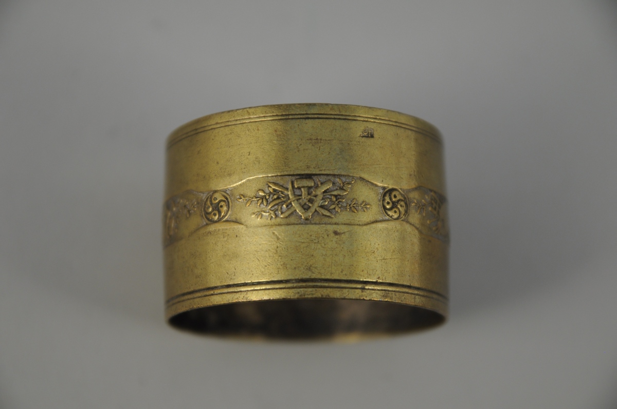 ROND de SERVIETTE en métal doré. Décor en frise de trophées maçonniques et feuillages, filets sur les bords. XIXème. Diam. 5 cm.