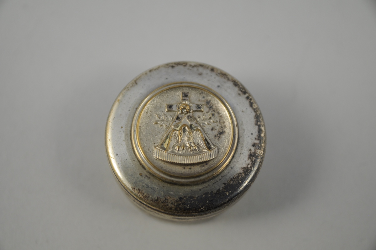 LOT comprenant sept petite BOITES rondes et deux médaillons porte-photos en étain. Décor ciselé d'attributs maçonniques. XIXème et XXème. Diam. des boîtes 3,5 cm, Diam. des médaillons 3,8 cm.