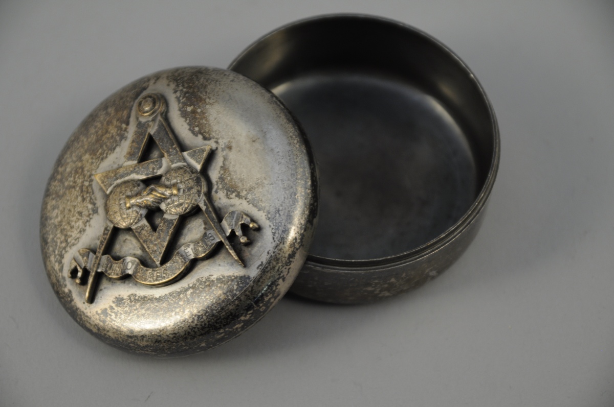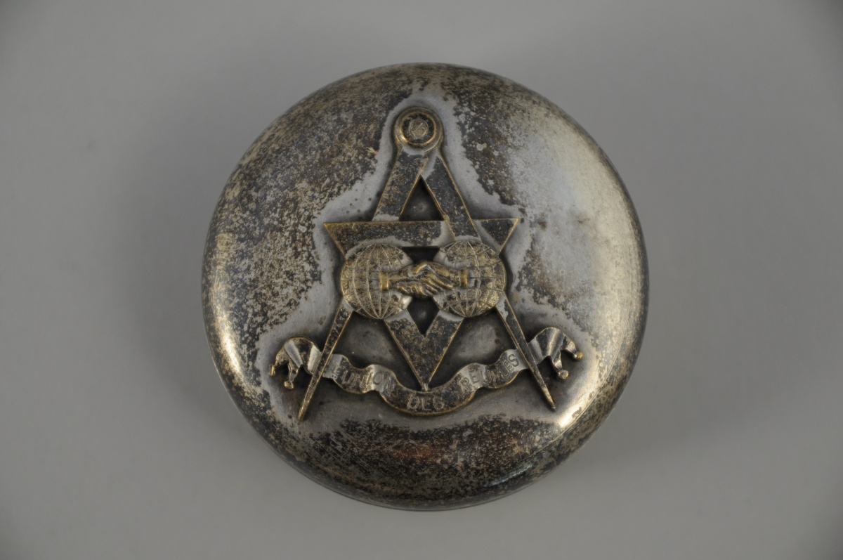 BOITE ronde en étain. Décor appliqué d'attributs maçoniques et d'un philactère portant l'inscription "L'UNION DES PEUPLES". XXème. Diam. 6,8 cm.