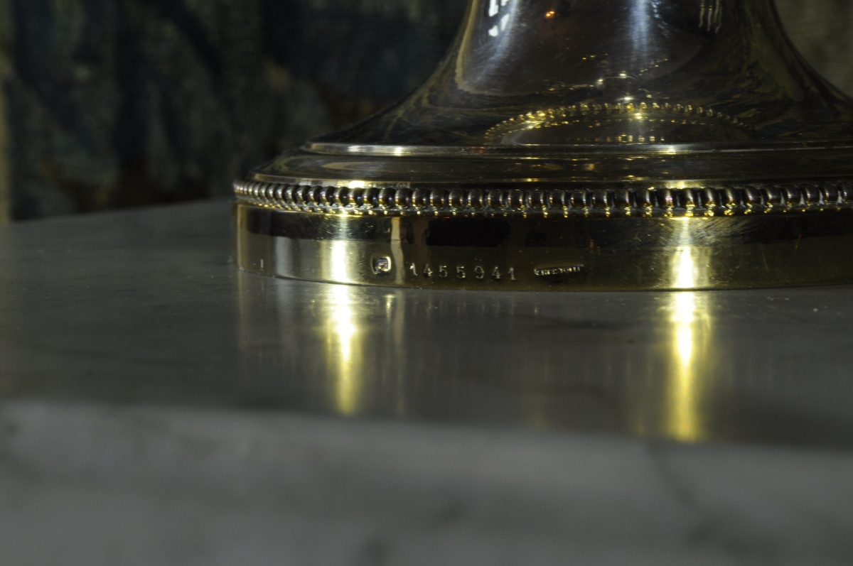 Paire de CANDÉLABRES en métal argenté à cinq lumières, sur fût balustre à rangs de perles. Maison Christofle. XXème siècle. Hauteur: 48,5 cm.