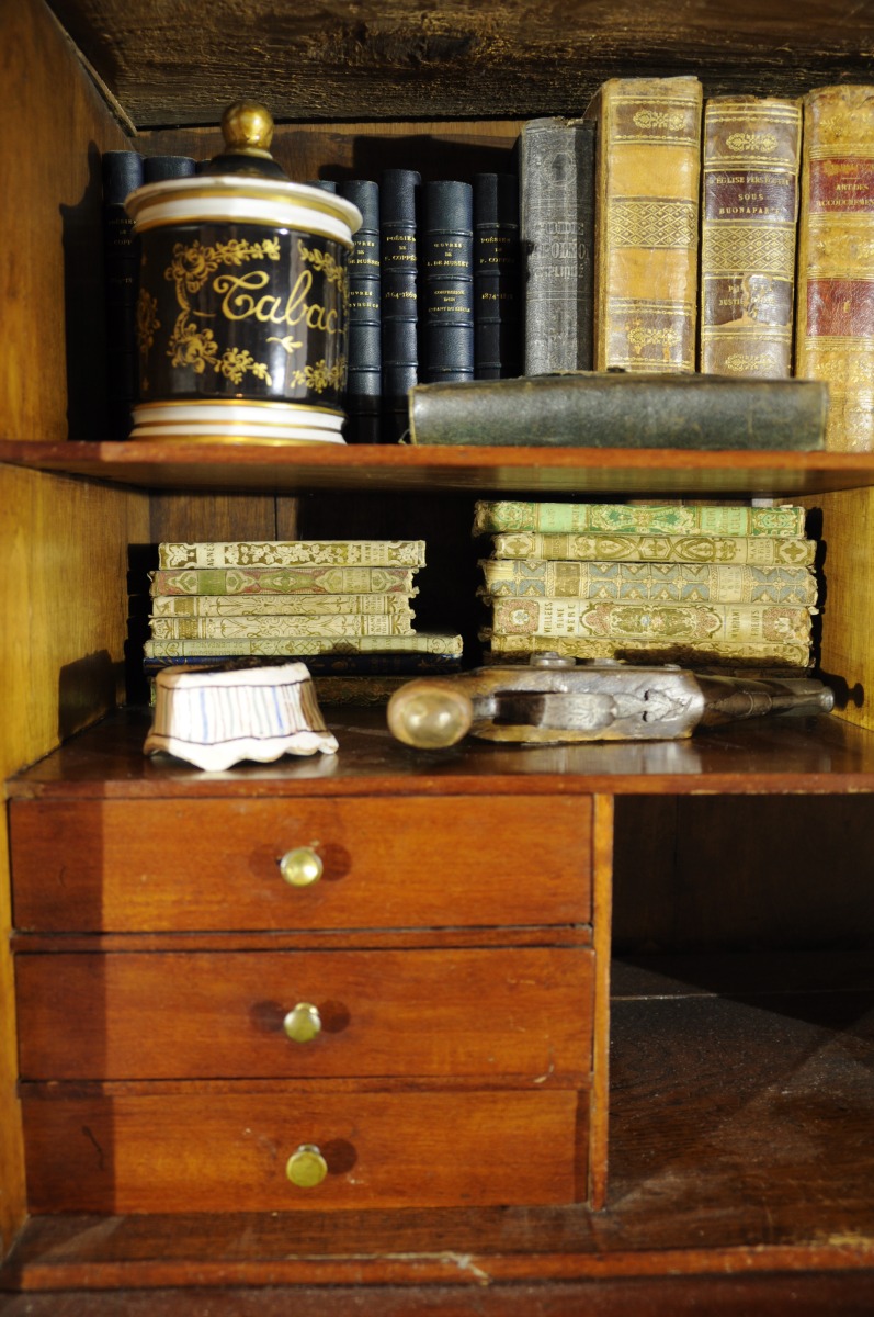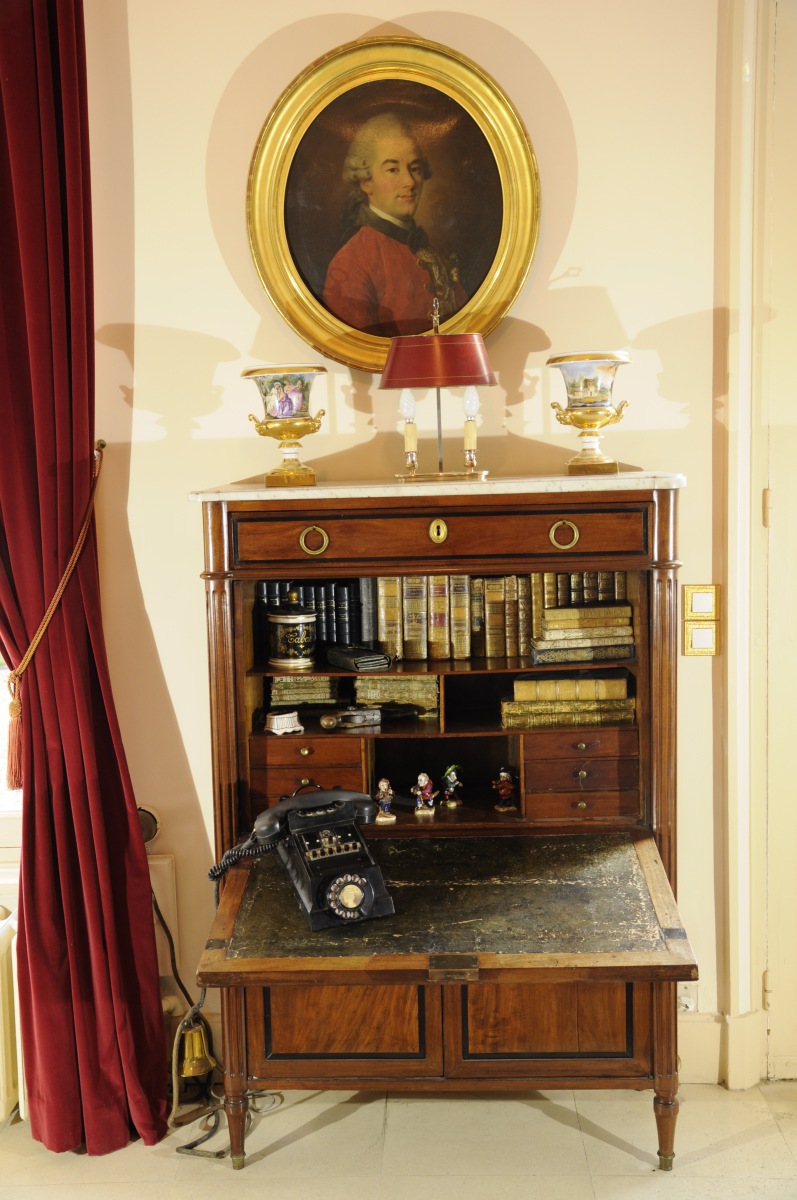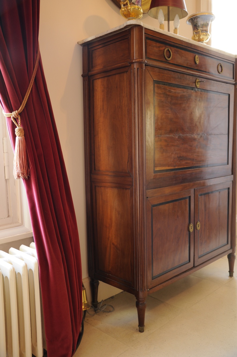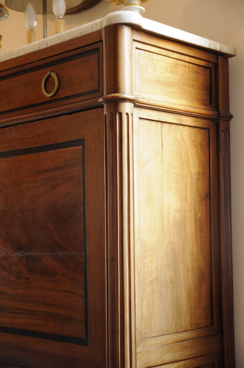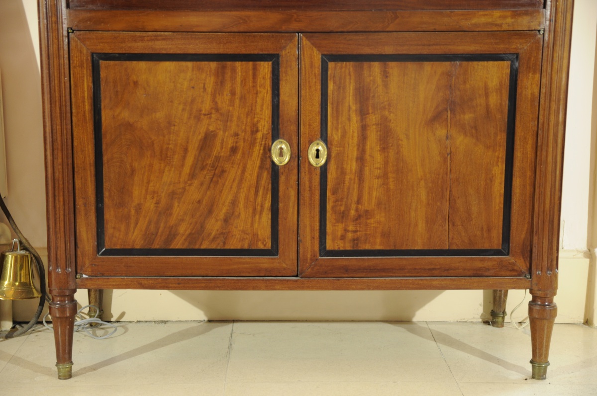 SECRÉTAIRE en acajou et placage d'acajou ouvrant à un tiroir et un abattant en partie supérieure et deux portes en partie inférieure, chaque élément soulignés d'un entourage noirci. Montants antérieurs cannelés, terminés par des pieds bagués. Dessus de marbre blanc.