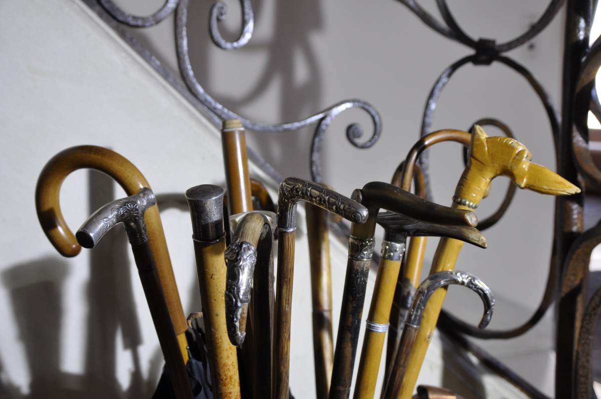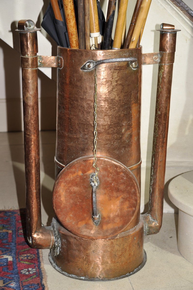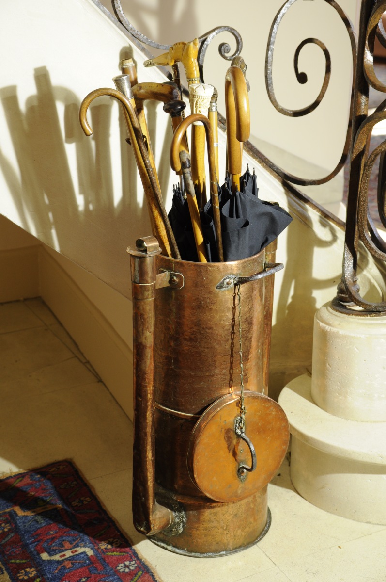 LAITIÈRE circulaire en cuivre à deux anses verticales et bouchon retenu par une chainette. Sept CANNES à bagues ou poignées métalliques, trois OMBRELLES ou parapluie, six CANNES en jonc ou bois.