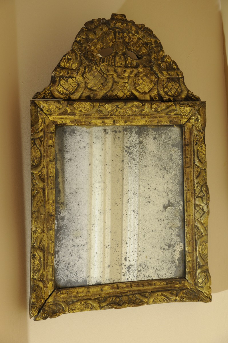 Petit MIROIR À FRONTON en bois sculpté et doré de feuilles, treilles et fontaine, glace au mercure.