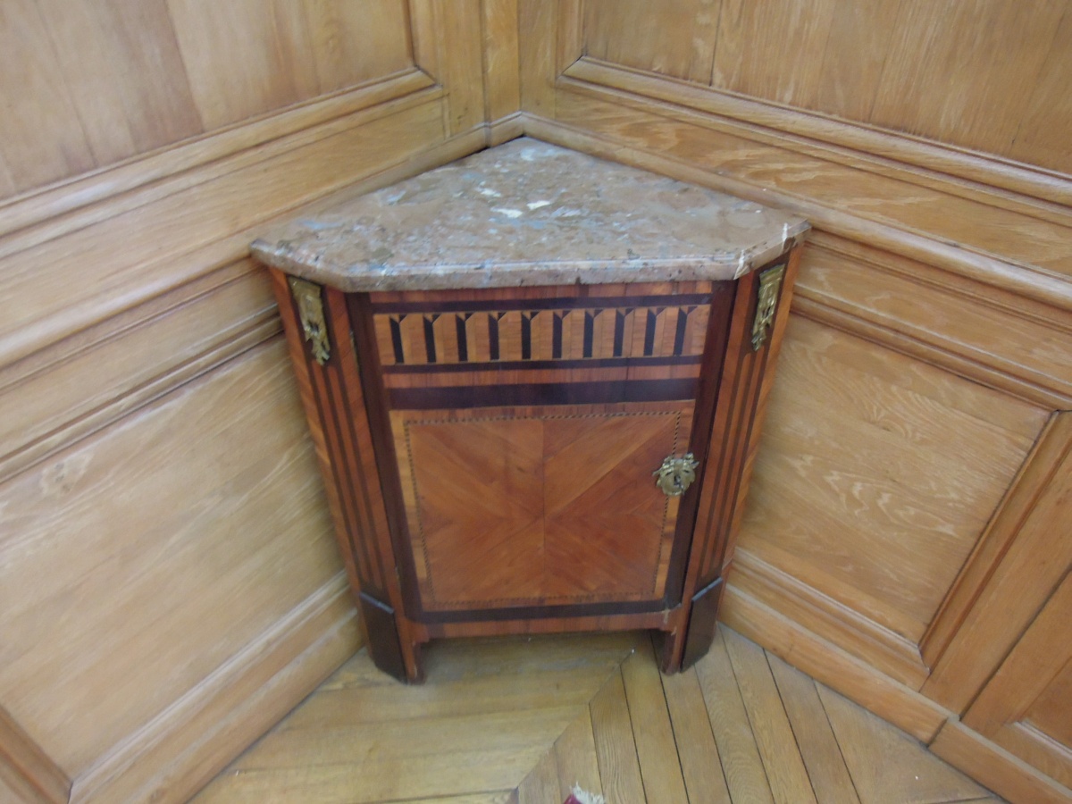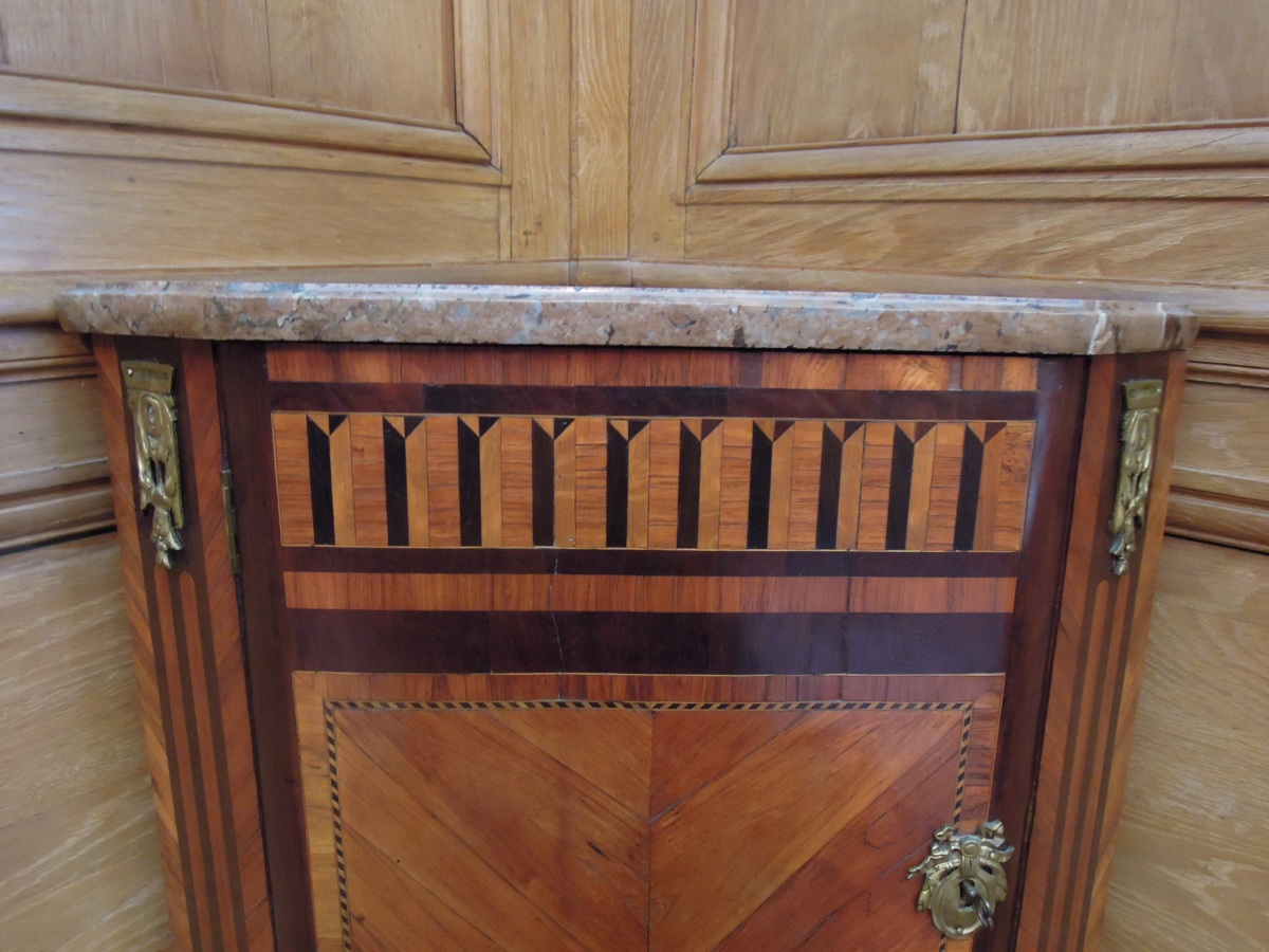 ENCOIGNURE en placage de palissandre, de bois de rose et de violette ouvrant à une porte marquetée, les montants antérieurs à pans coupés simulant des colonnes triglyphes surmontés de chutes d'angle en bronze doré à motifs de chapiteaux corinthiens. Entrée de serrure en bronze doré à motif d'un médaillon fleuri. Dessus de marbre brèche. Estampillée "B VASSOU". Jean-Baptiste Vassou reçu maître en 1767.