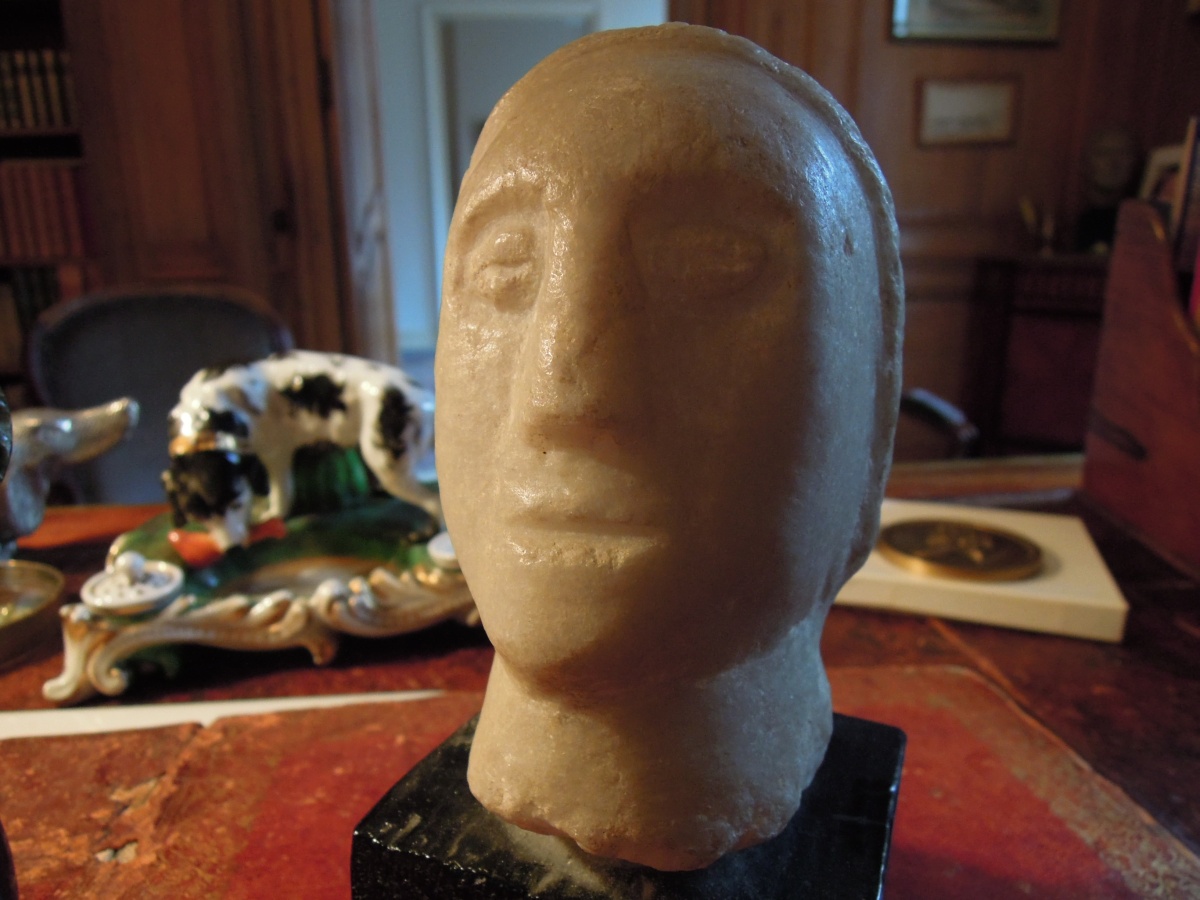 ARCHÉOLOGIE. TÊTE en marbre blanc (Haut. 12 cm), TÊTE en bronze (Haut. 11,5 cm), trois LAMPES À HUILES en terre cuite, MASQUE MÉSOAMERICAIN en terre cuite (Larg. 9 cm) , CONQUE fossilisé (Diam. 6,5 cm), trois FIGURINES en pierre sculptées (Haut. de 4,5 à 12 cm)