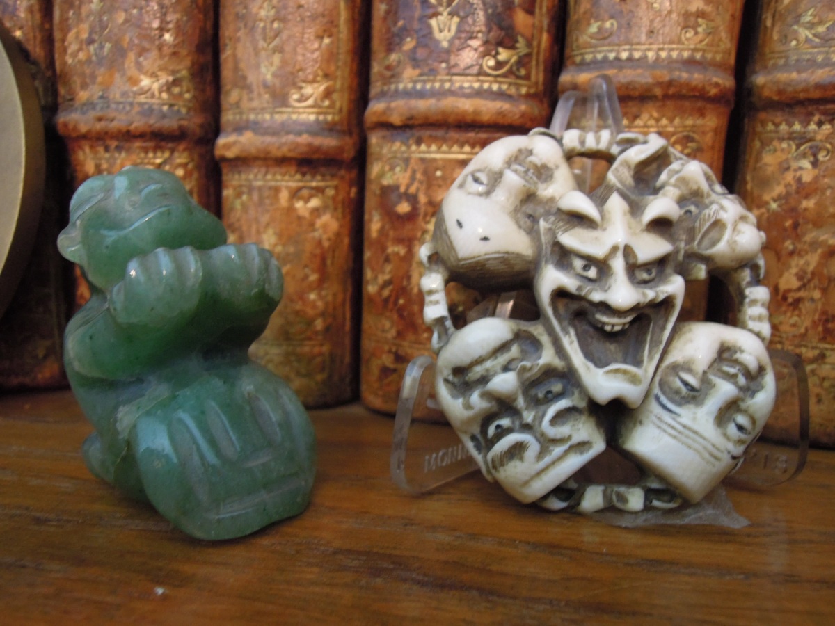 - NETSUKE en ivoire de forme ovale à motifs de cinq masques grimaçant, signé (Long. 6 cm).