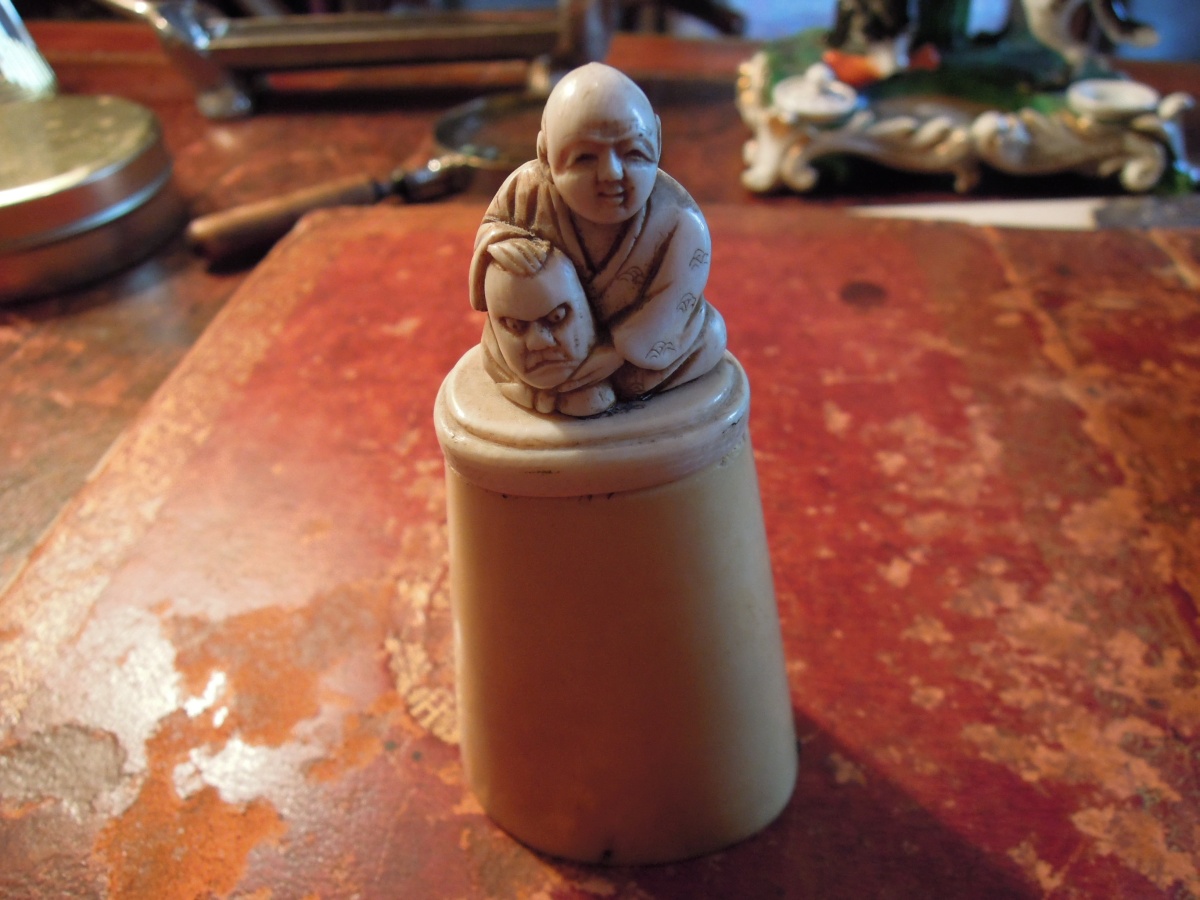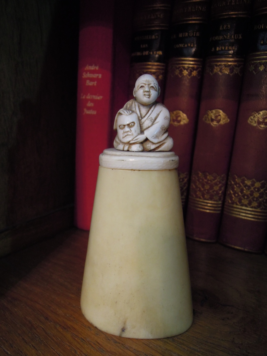 - GOBELET en ivoire, le bouchon orné d'un acteur de théâtre en ronde bosse présentant un masque (Haut.: 11,3 cm).