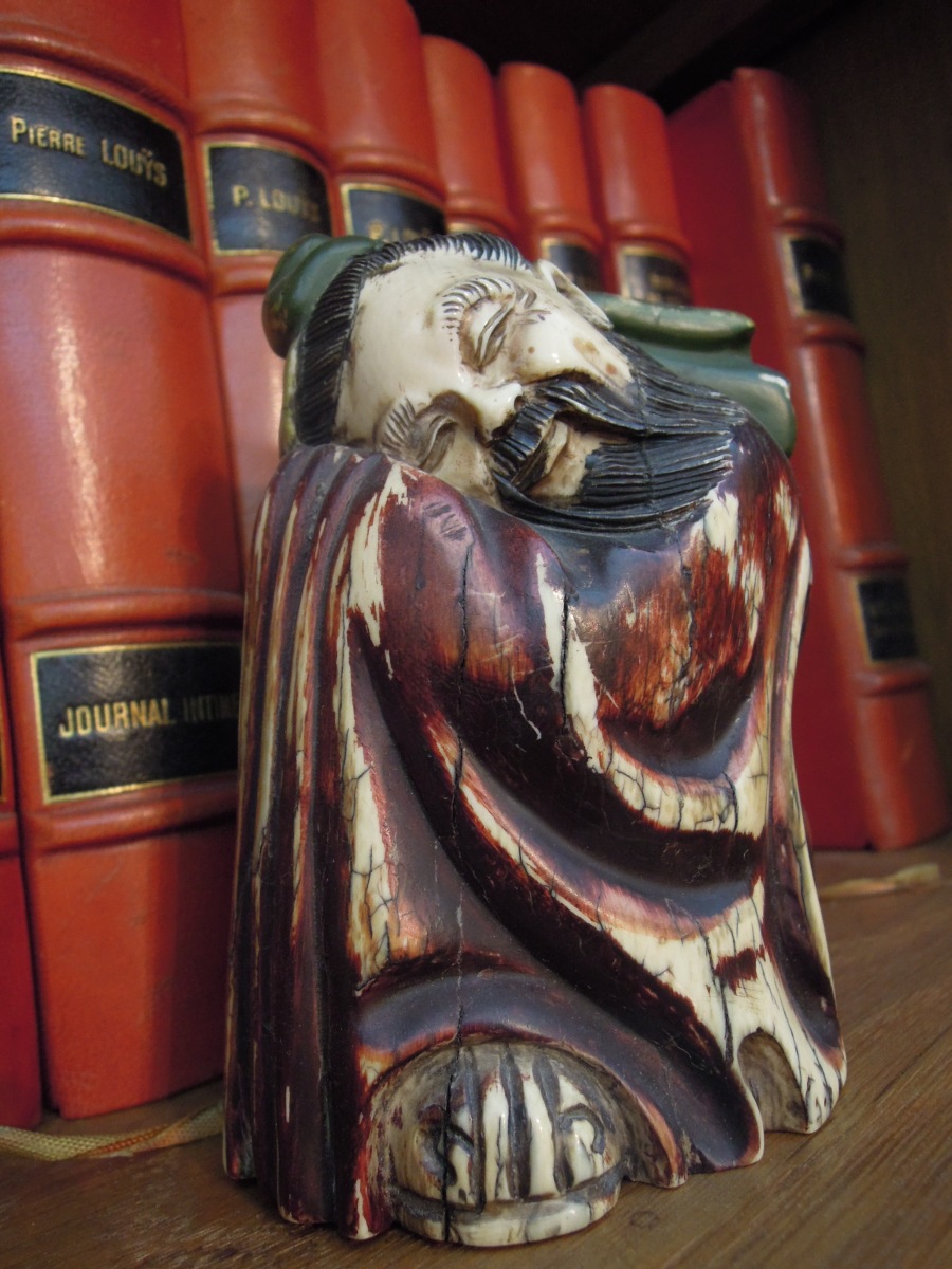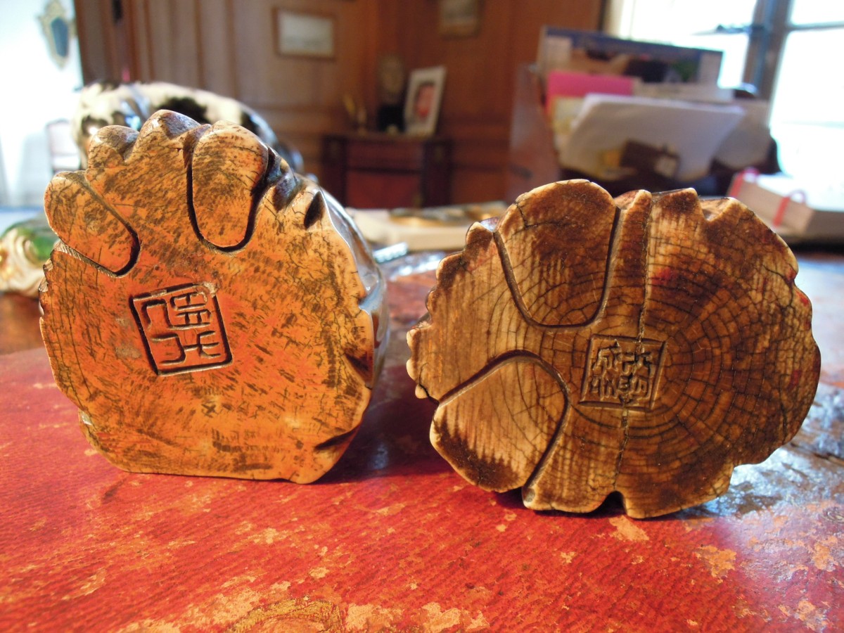 - Deux HOMMES ENDORMIS en ivoire blanc et polychrome signés (Haut.: 10 et 11,5 cm).