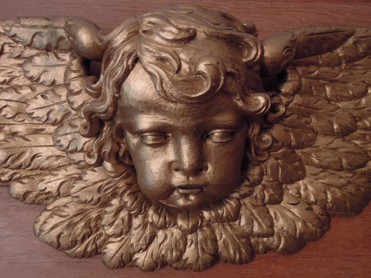 TÊTE D'ANGE bouclé dans l'entourage de ses ailes déployées, en bois sculpté et doré. Hauteur: 30, Largeur: 71 cm.