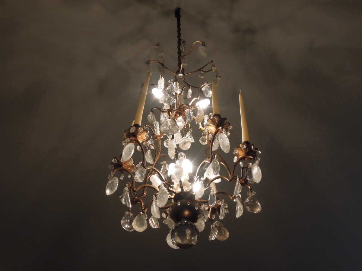 LUSTRE CAGE en bronze à six feux, électrifié en parties haute et basse à trois couronnes de pampilles de verre et cristal de roche réunies au centre par une pyramide soutenant une boule lisse.