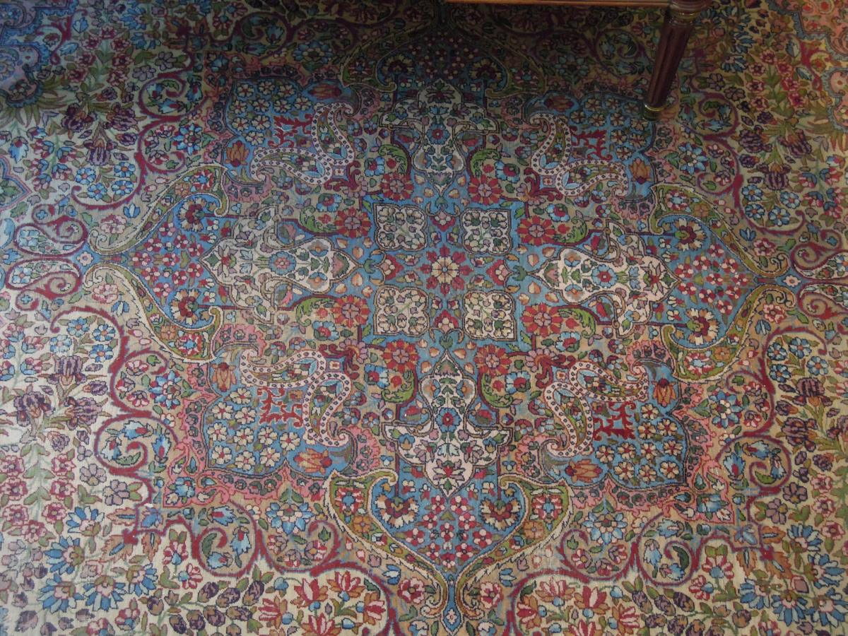 Tapis KESCHAN, Nord-ouest de la Perse, première moitié du XXème. Sur un fond ivoire à décor floral stylisé polychrome, se détache un double médaillon central bleu et ivoire, prolongé de deux pendentifs. Lensemble de la composition est agrémenté de quatre écoinçons tabac. Large bordure principale ivoire à succession de bouquets fleuris encadrée de trois contre-bordures bleues et tabac.
