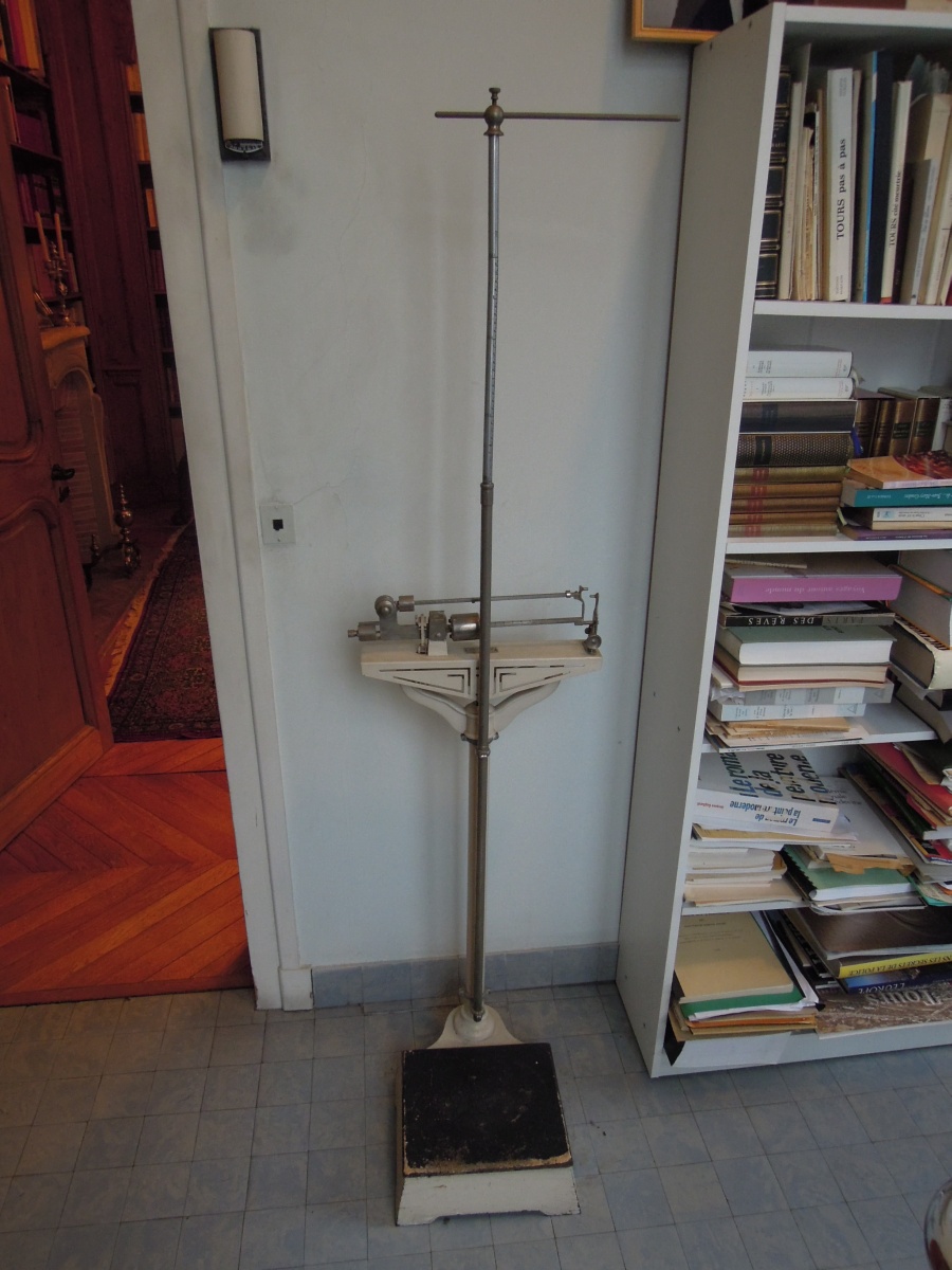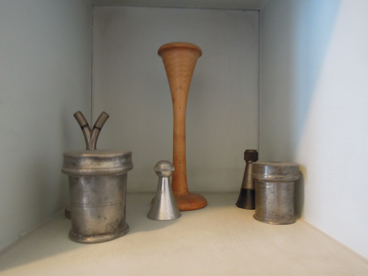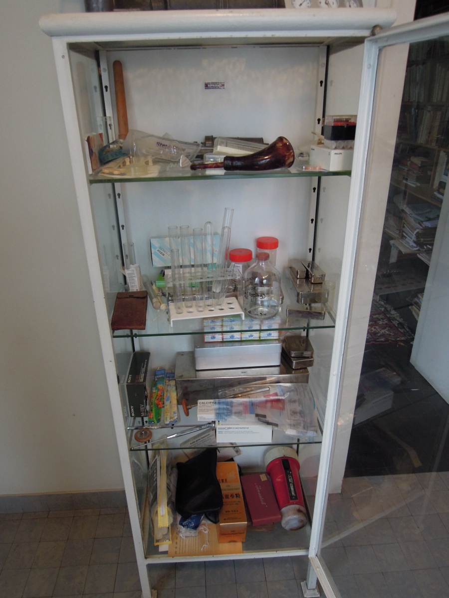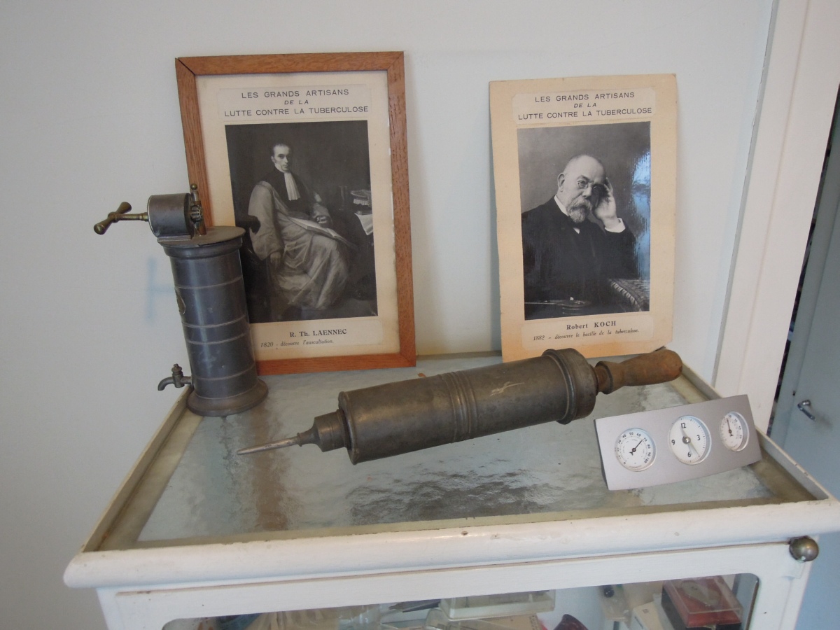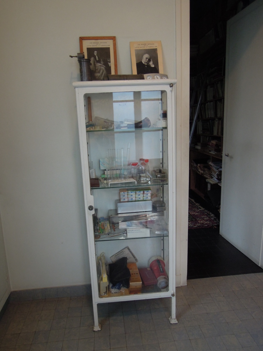 Joint: CLYSTÈRE, SERINGUES, IRRIGATEUR, MESURES, BOÎTES DE DENTISTES en étain, VITRINE métallique laquée blanche.