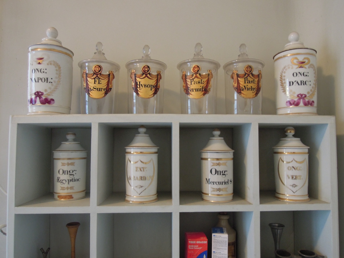 Quatre POTS À PHARMACIE en porcelaine blanche décorée à l'or et marqués "EXT: de BARDAN", "ONG: VERT.", "Ong: Aegyptiae", Ong: Mercuriel S:".