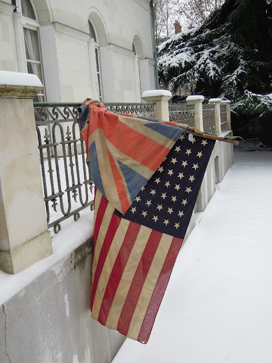 UNION JACK (147 x 78 cm) et BANNIÈRE ÉTOILEE (100 x 145 cm) confectionnés par les F.F.I. de façon artisanale et ayant pavoisé la ville de Tours à la fin du second conflit mondial.