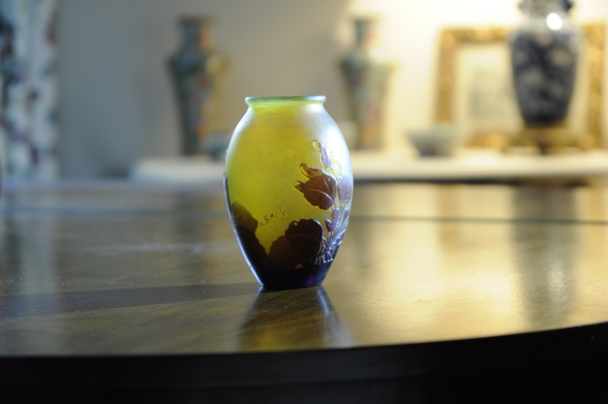 VASE OVOÏDE en pâte de verre multicouche gravé à l'acide de fleurs de pensées brunes sur fond jaune. Signé Gallé. Hauteur: 11,5 cm.
