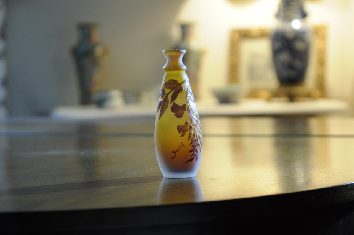 Petite BOUTEILLE en pâte de verre multicouche gravée à l'acide de fleurs de glycines brunes sur fond orange. Signé Gallé. Hauteur: 12,5 cm.