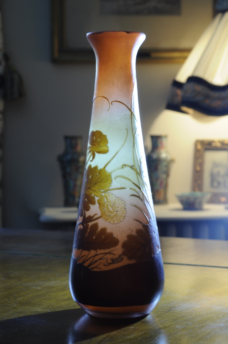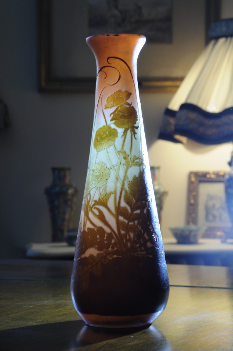 VASE ÉLANCÉ en pâte de verre multicouche gravé à la roue et à l'acide de fleurs de pavots brunes sur fond rouge et clair. Signé Gallé. Hauteur: 40 cm.