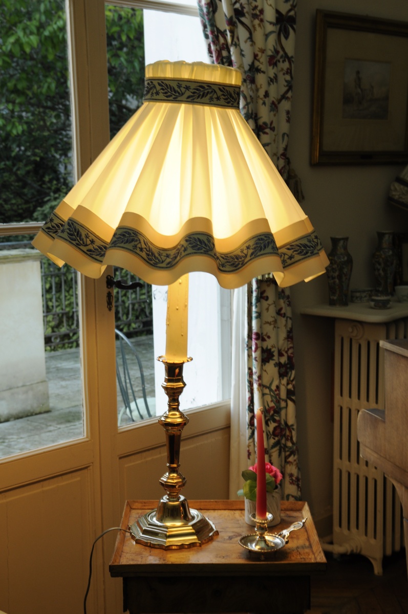 Joint: BOUGEOIR en bronze argenté, électrifié et orné d'un abat-jour. Style Louis XVI, XXème. Hauteur totale: 100 cm.