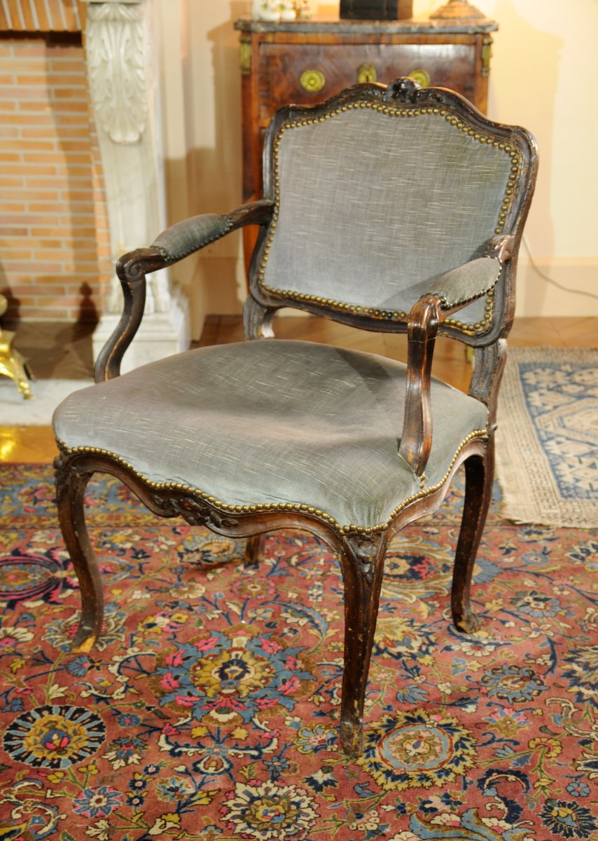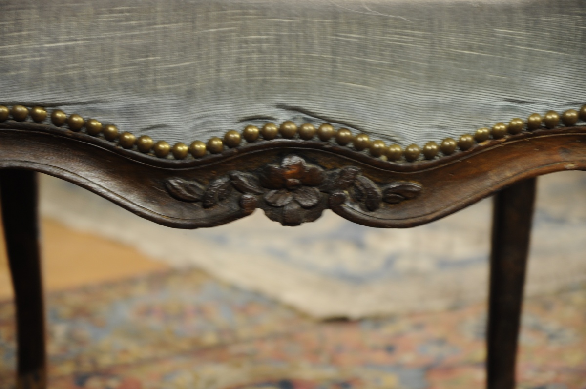 Petit FAUTEUIL À COIFFER en bois naturel noirci, sculpté de fleurs et feuillages. Le dossier à la Reine, les accotoirs à manchette tombant en coup de fouet en retrait de la ceinture et reposant sur quatre pieds galbés feuillagés.