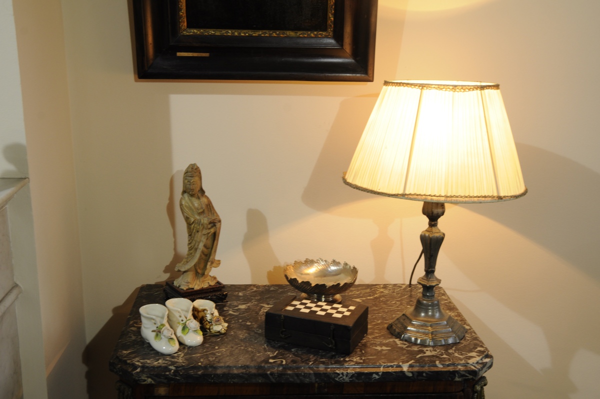LAMPE en étain, STATUETTE CHINOISE en pierre de savon, COUPE...
