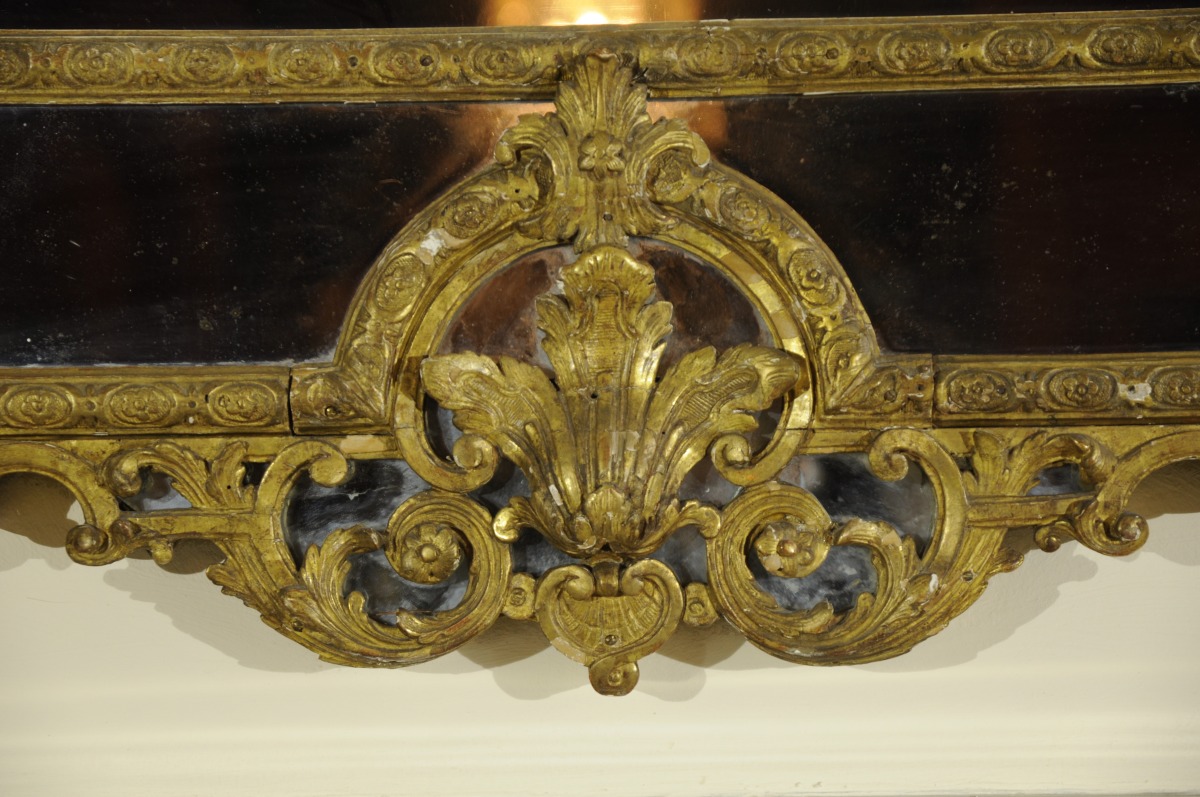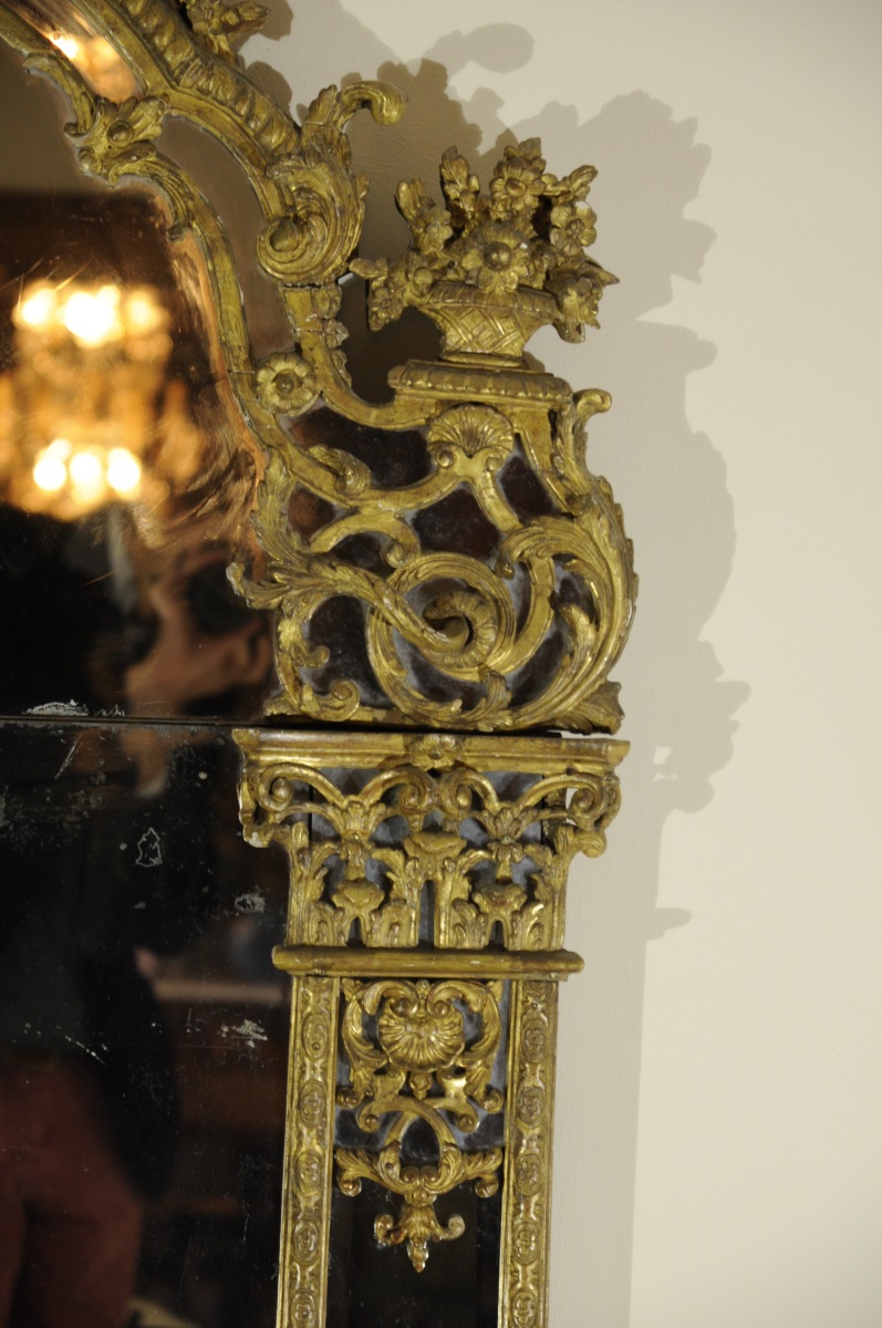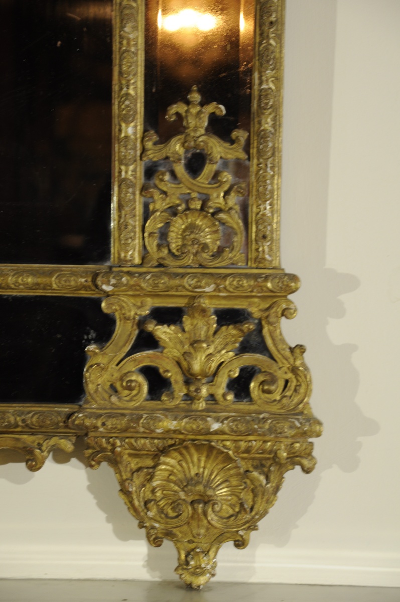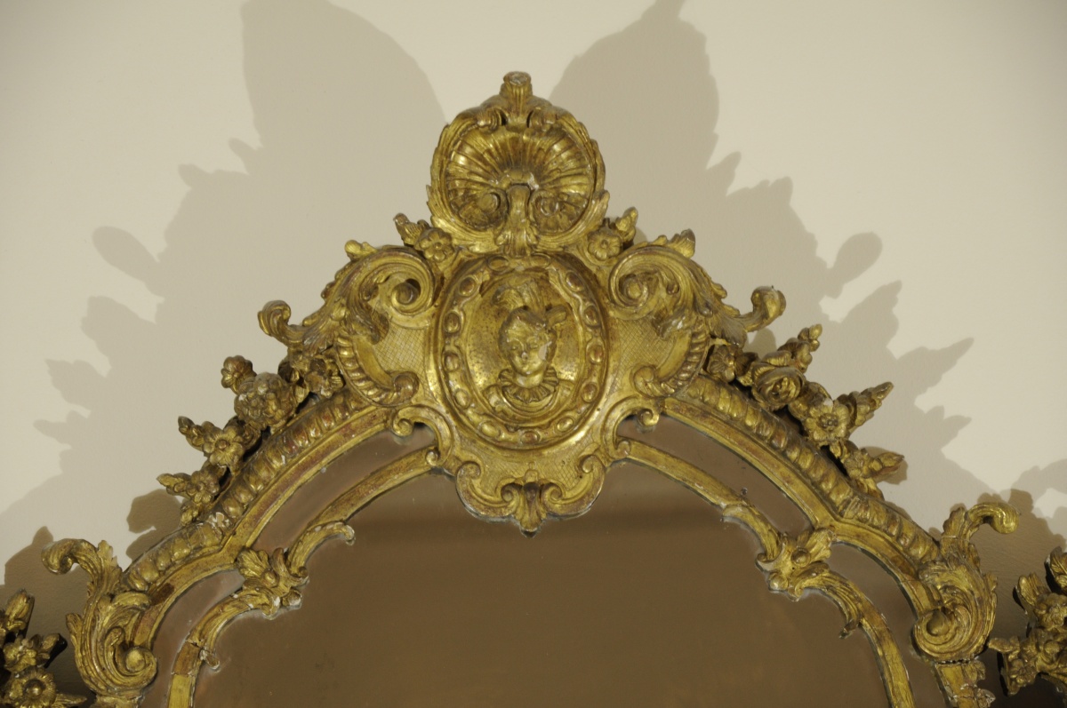 Grand MIROIR À PARE-CLOSES en bois sculpté, stuqué et doré. Le décor rapporté, finement sculpté tout le long de guirlandes fleuries. Le fronton orné d'un Indien à panache dans un médaillon surmonté d'une coquille dans un entourage de roses. Les montants figurants de fines colonnes à coquilles et fleurs de lys entrelacées, surmontées de chapiteaux corinthiens soutenant des entrelacs de feuillages stylisés et des paniers fleuris. Il repose sur deux pieds à coquilles et feuillages en cul de lampe. Miroir au mercure.