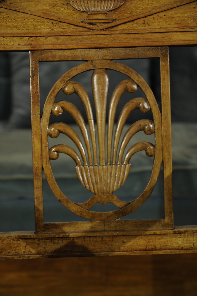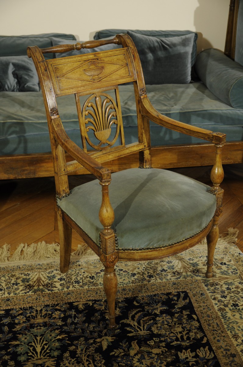 SALON en bois sculpté composé d'un LIT DE REPOS à frontons et colonnes cannelées, d'un FAUTEUIL et de deux CHAISES à dossiers ajourés de vases et de palmettes. Piétement godronné pour le lit, balustre à l'avant pour les sièges et sabre postérieurement.