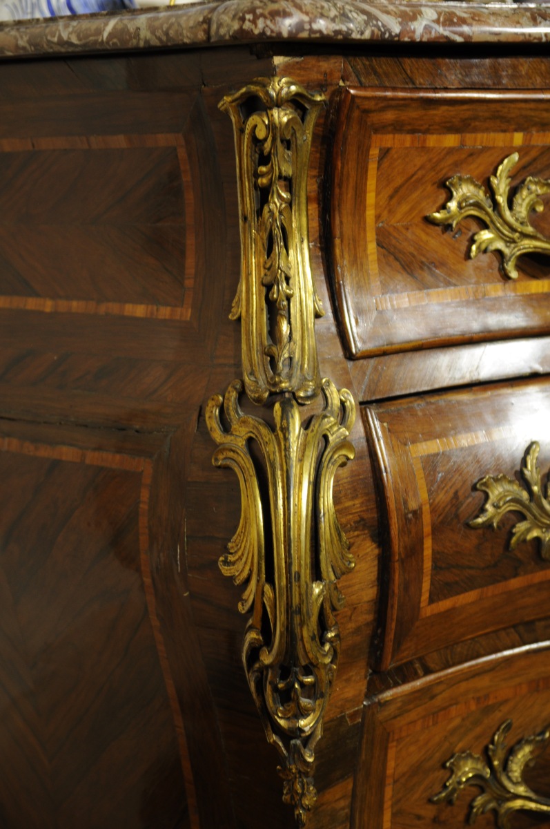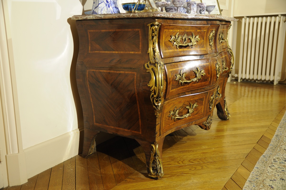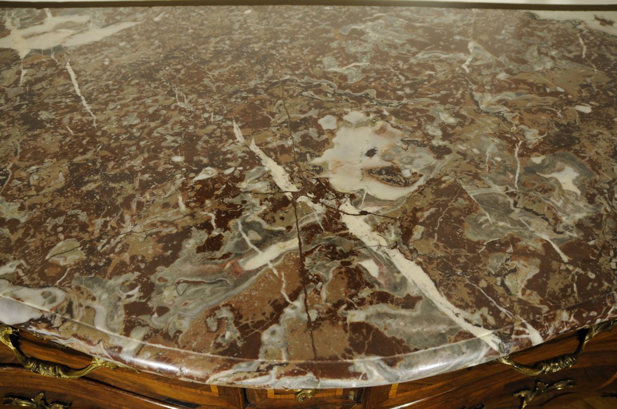 COMMODE TOMBEAU galbée toutes faces, ouvrant à cinq tiroirs sur trois rangs, marquetée en satiné, bois de roses et bois de violettes d'encadrements géométriques. Très riche ornementation de bronzes feuillagés pour les chutes d'angles et les sabots, les entrées de serrure et les poignées de tirage (repercées). Dessus de marbre brèche (restauré). Estampillée sur le dessus de chaque montant postérieur "JME" et "ACRIAERD".