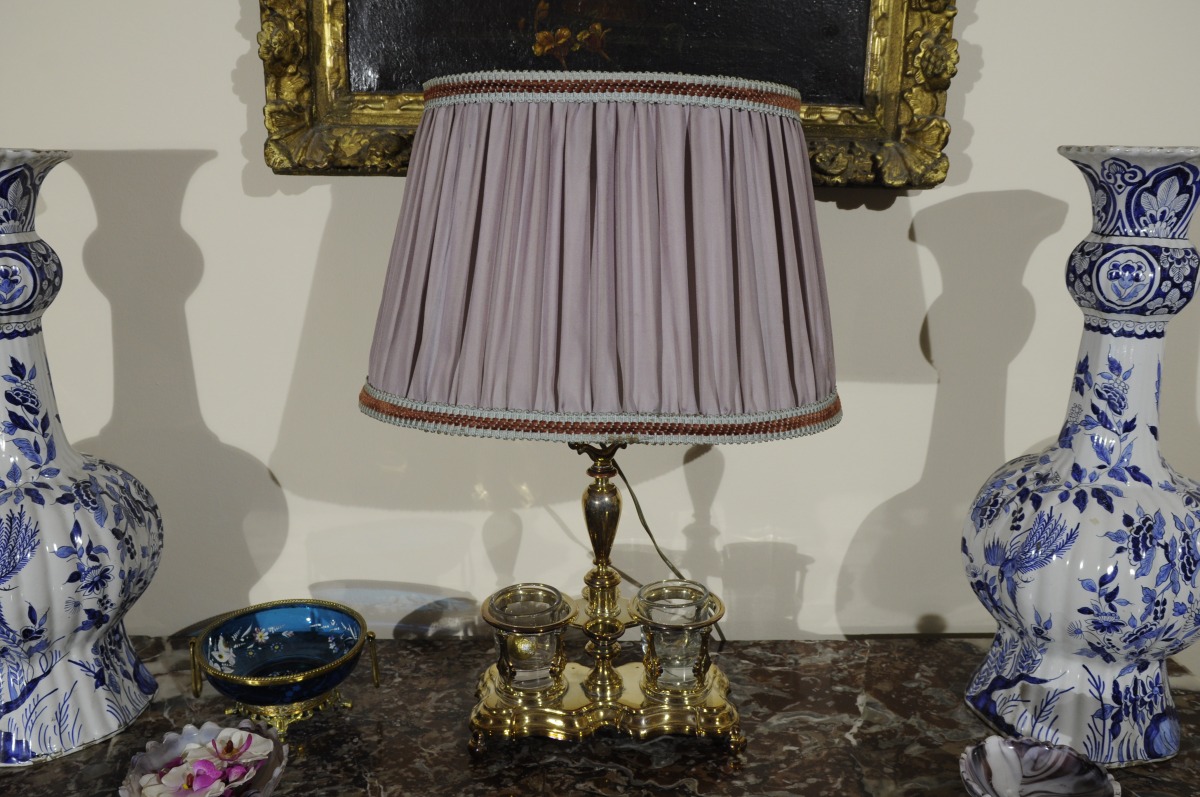 HUILIER-VINAIGRIER en métal argenté, monté en LAMPE D'APPOINT avec un abat-jour rose puis électrifié, sur une base ovale à quatre pied feuillagés.
