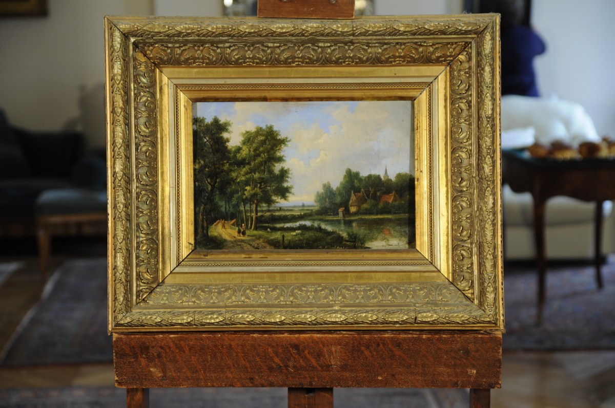 École HOLLANDAISE du XIXème siècle.Promeneurs près d’une rivière.Panneau.21 x 30...