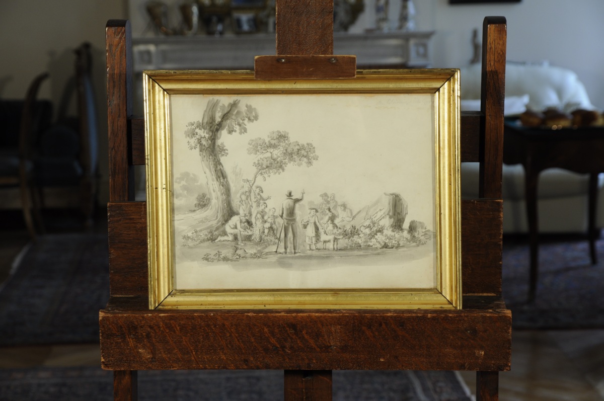 École ITALIENNE du XIXème siècle.Le repos des paysans.Lavis gris.24,5 x...