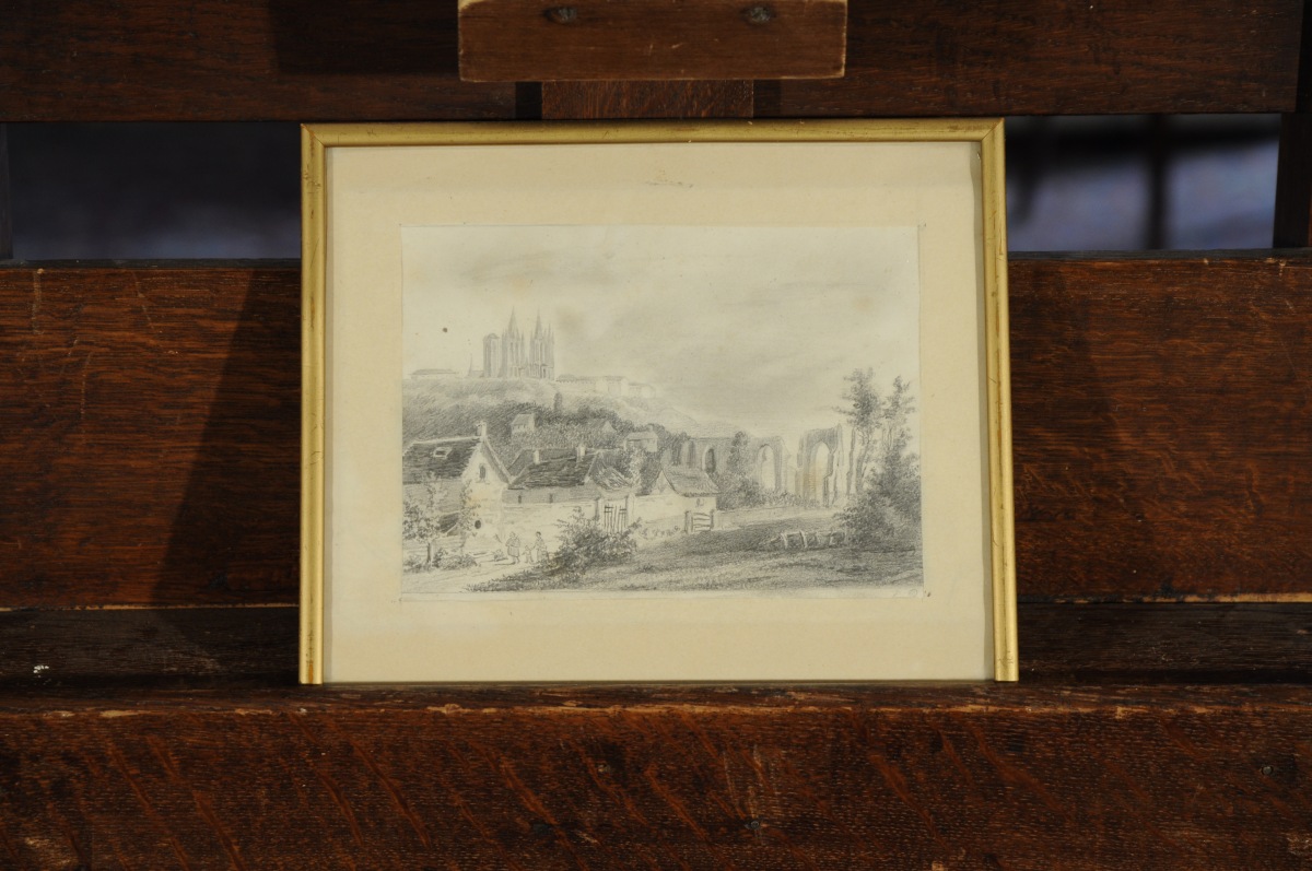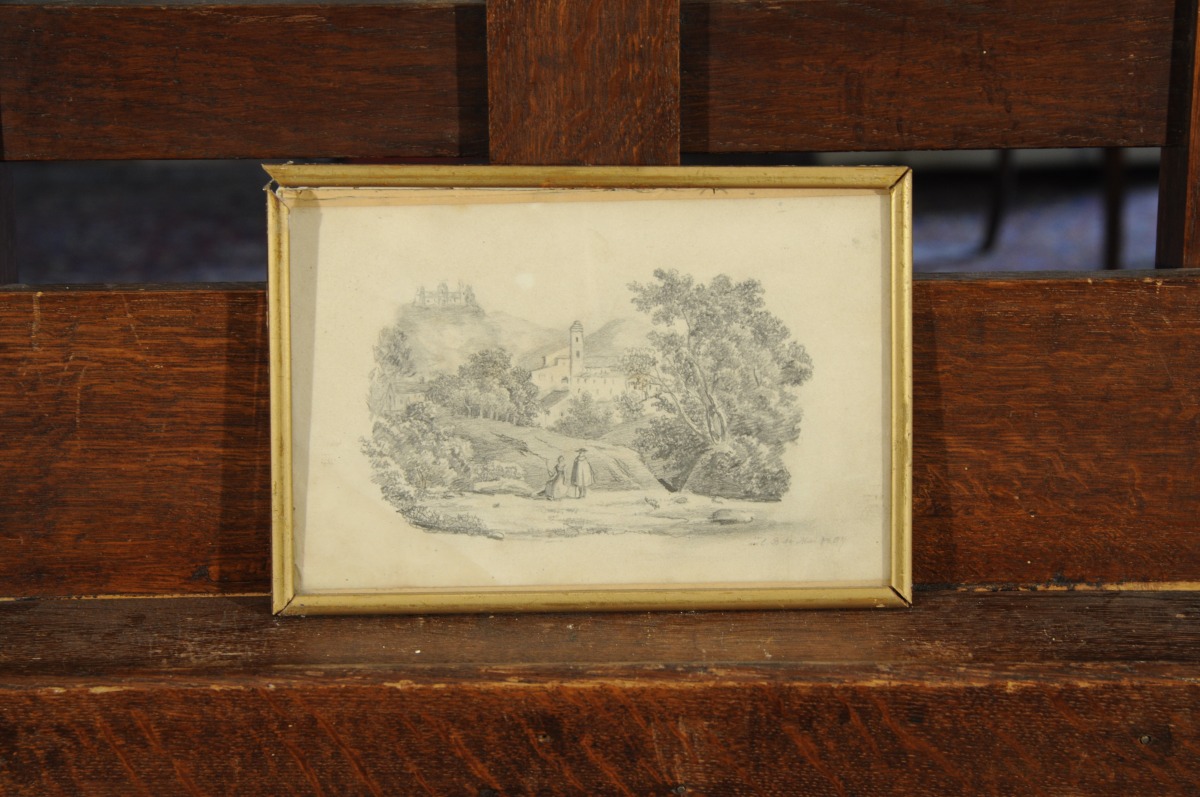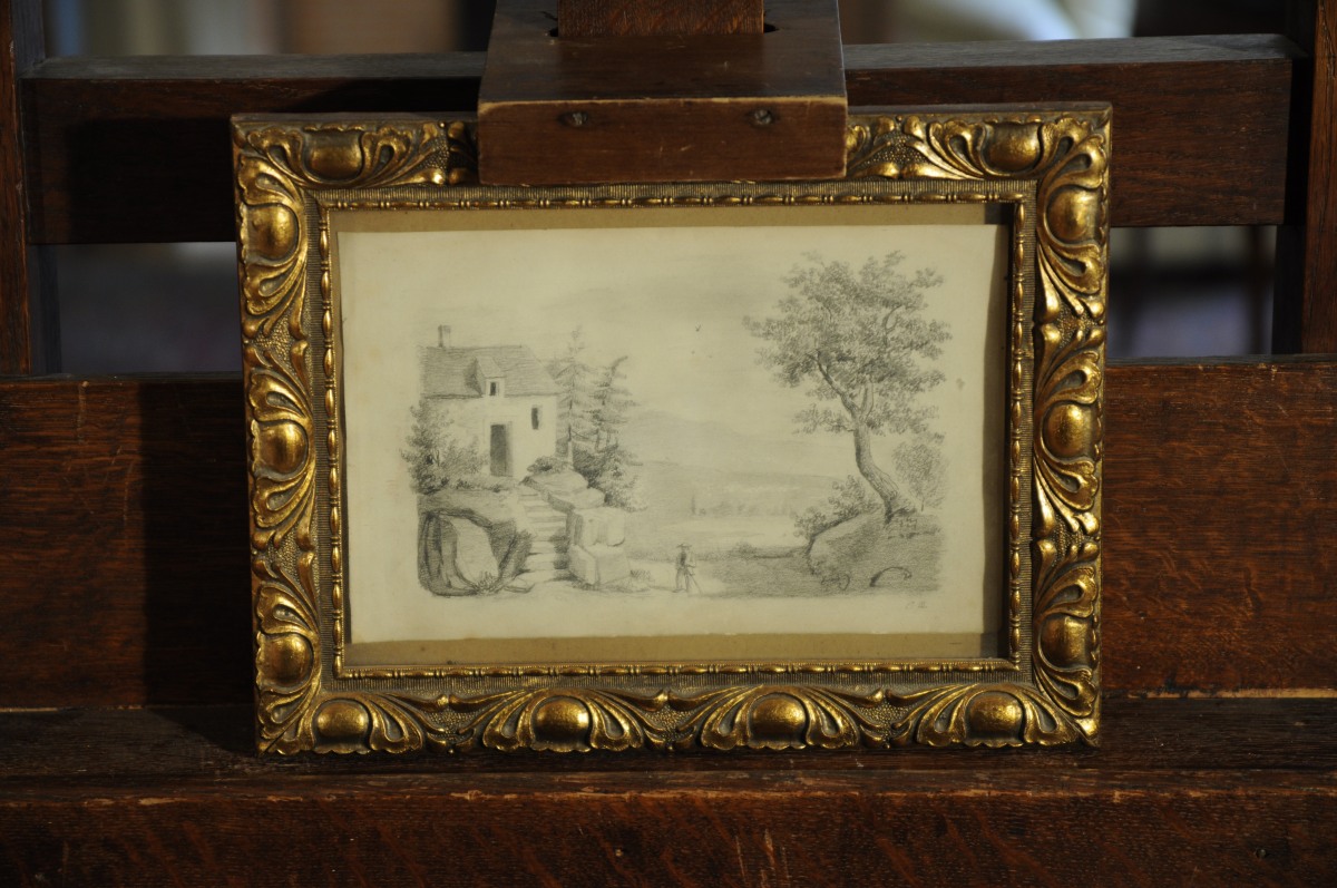 École FRANÇAISE du XIXème siècle.Paysans près d’une chaumière.Crayon noir.16 x...