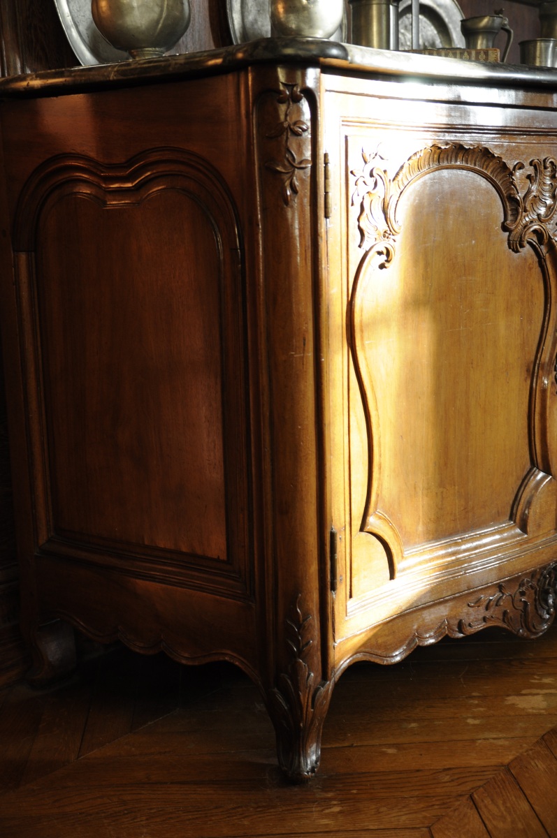 BUFFET en noyer à façade galbée ouvrant à deux portes, richement sculpté sur les vantaux, la ceinture, les chutes d'angle et les pieds de feuillages et de coquilles stylisées. Dessus de marbre gris.