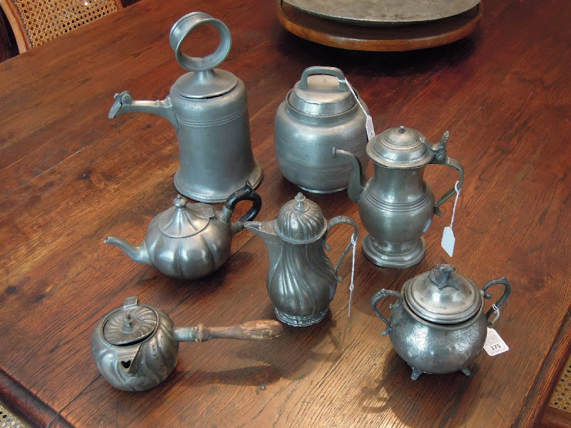 ÉTAINS: Quatre VERSEUSES de formes diverses, un ARROSOIR, un POT COUVERT et un SUCRIER.